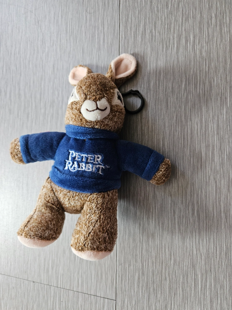 92Brown plush Peter Rabbit wearing a blue sweater. Attached keyring. Collectible.