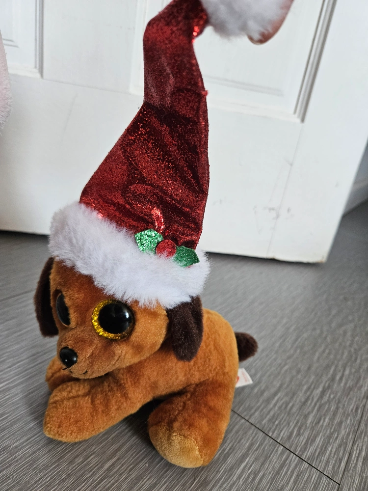 92Adorable brown plush dog wearing a sparkly red Santa hat. Perfect Christmas decoration or gift. Large, bright eyes.