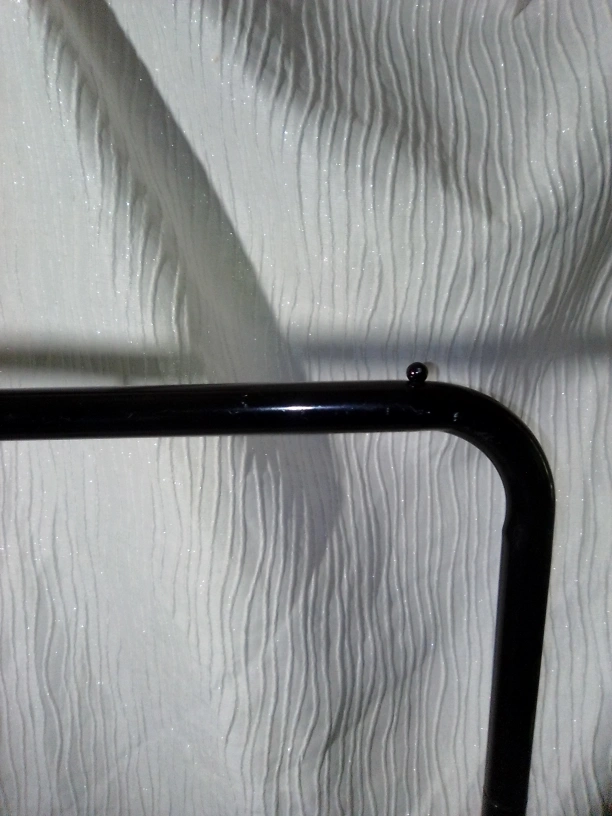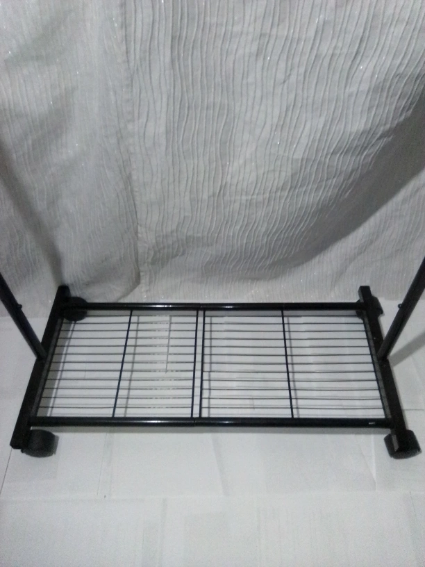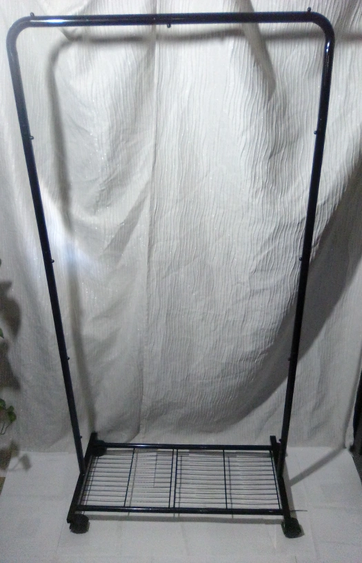 Free-standing garment rack. Black metal frame. Rolling wheels. Bottom shelf. Great for clothes storage. Also has hanger stoppers .