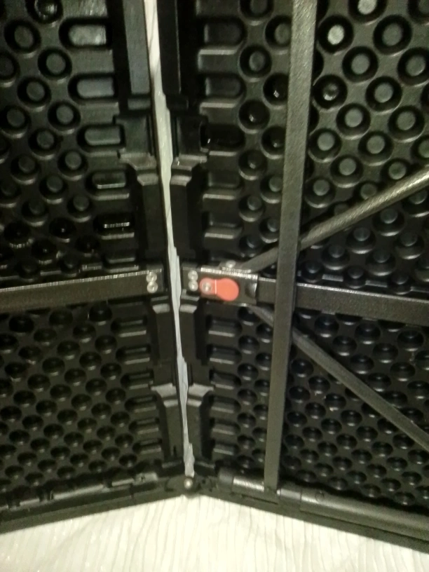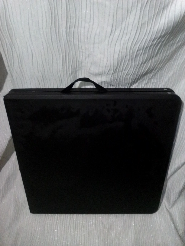 Sall Portable folding table. Black plastic top. Metal frame with handle. Easy to store and transport. Perfect for picnics, camping, or extra seating.