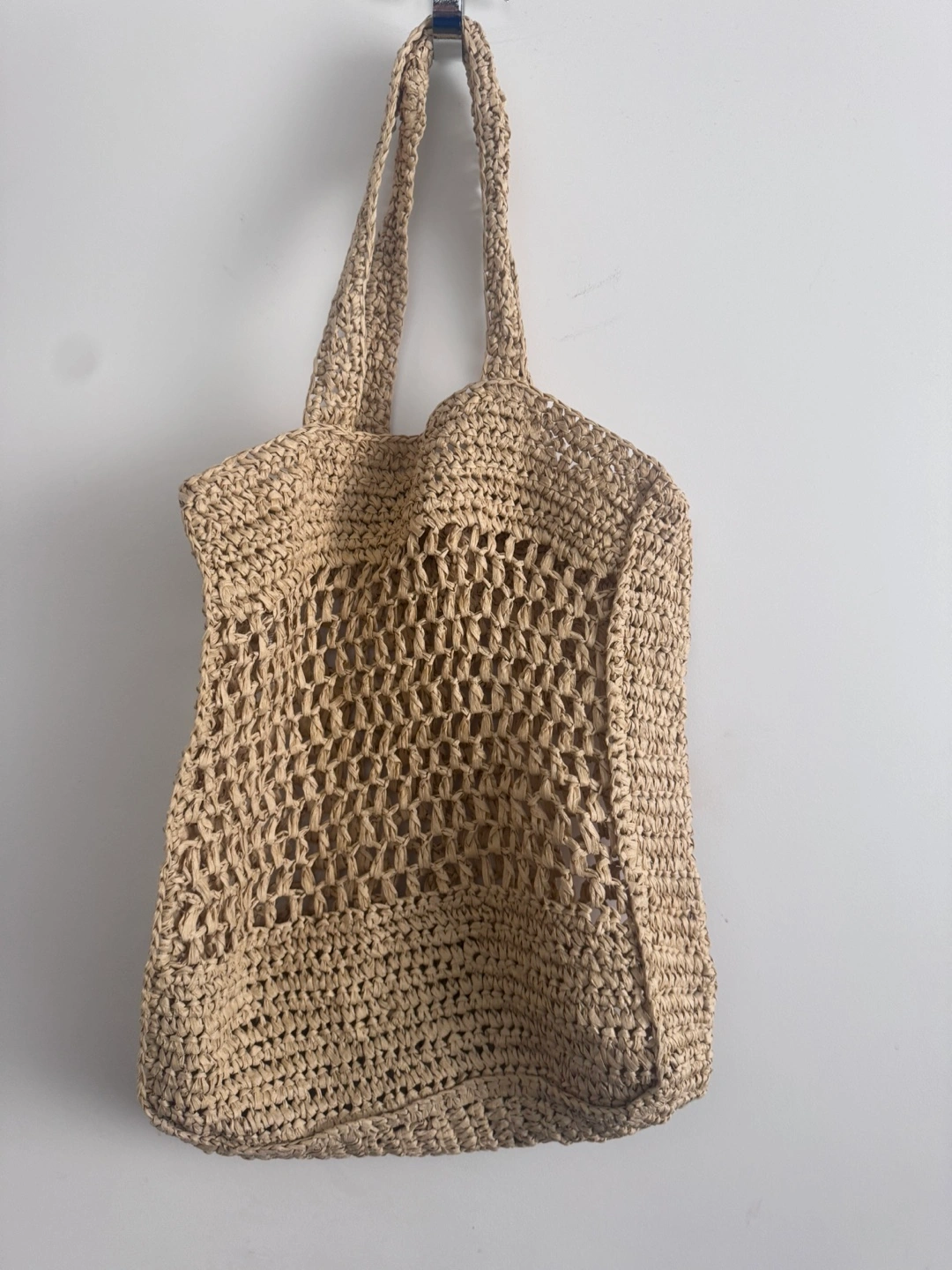 Beige crochet tote bag. Lightweight and perfect for summer. Open weave design. Features two shoulder straps.