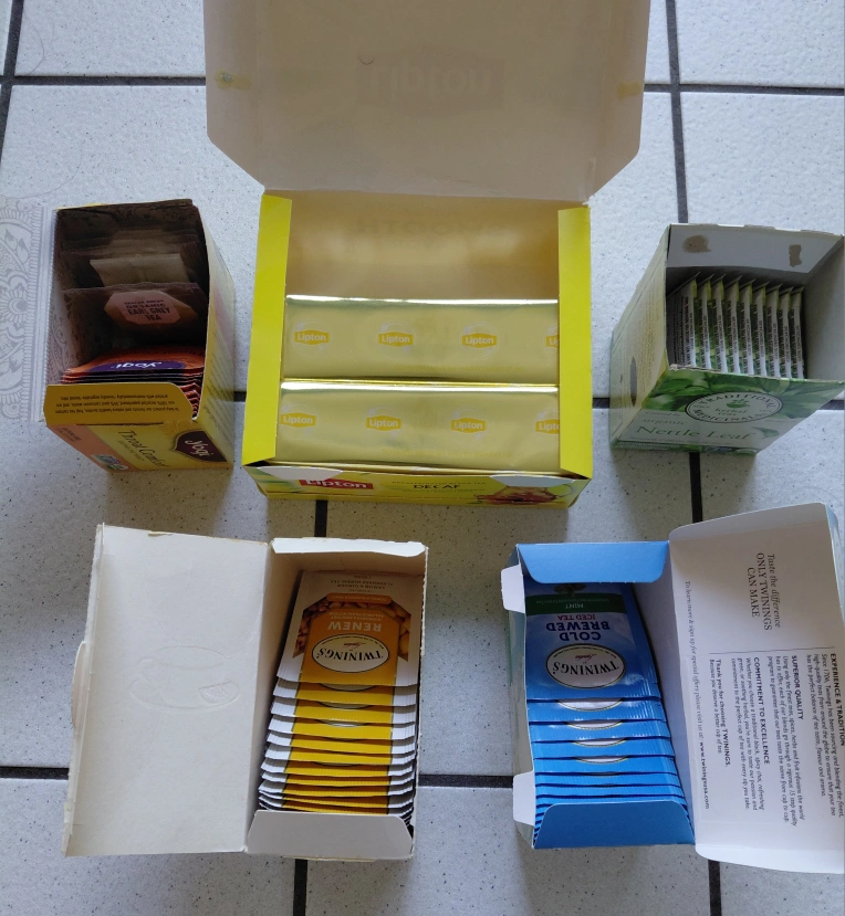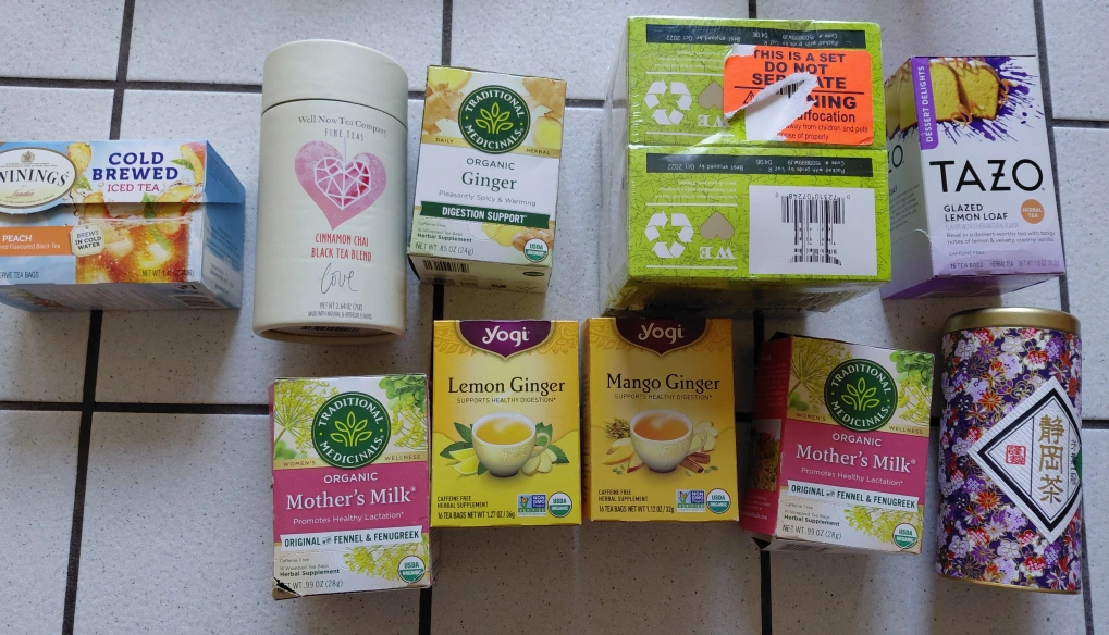 Take all for $30 Assortment of teas - Bigelow green tea bags, Lipton decaf black tea bags, Yogi tea bags in Lemon Ginger, Ginger, and Mango Ginger flavors, Mother's Milk herbal supplement tea bags and lit more
