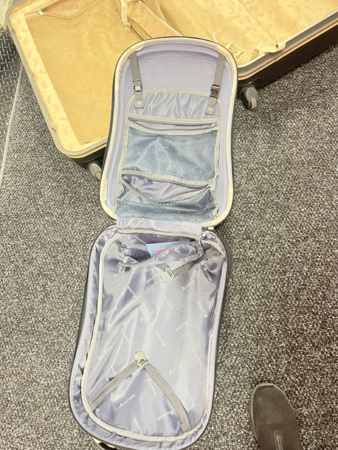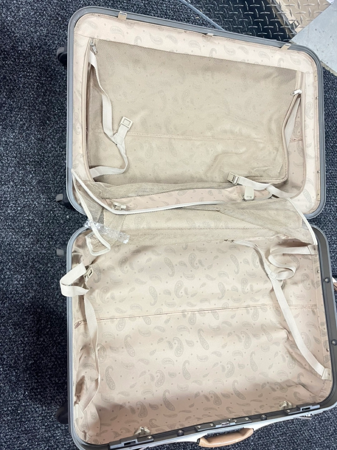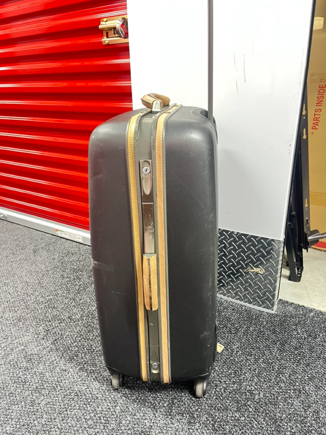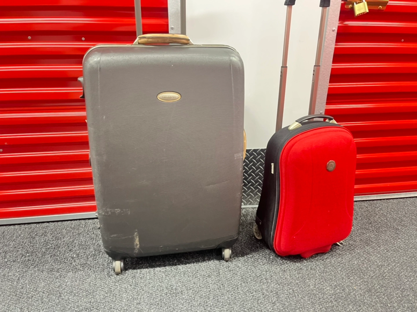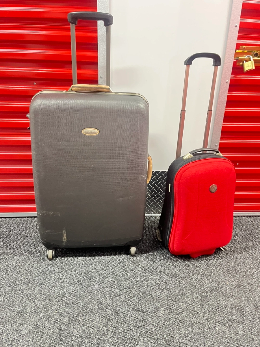 165Used rolling suitcase set. Includes one large and one smaller suitcase. Both have wheels and telescoping handles. Large suitcase shows some wear. Smaller suitcase is red.