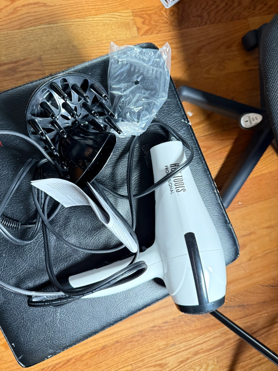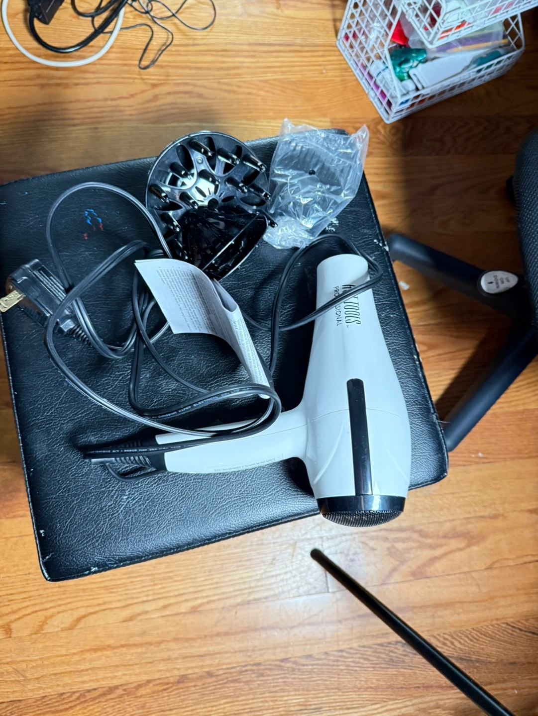 White hair dryer. Includes diffuser attachment. Gently used. Comes with instruction manual.