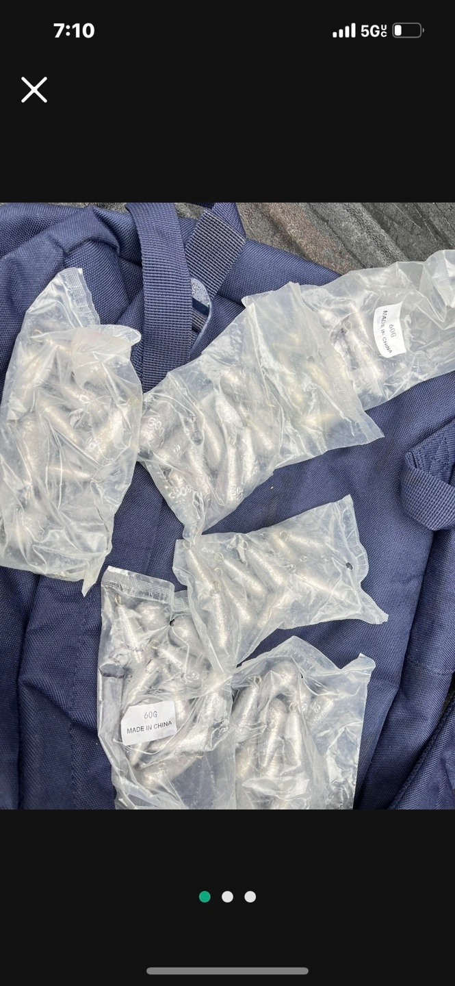 Multiple bags of 60g fishing weights. Made in China. Great for fishing.