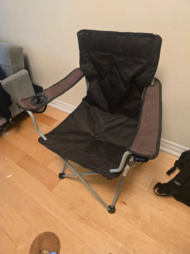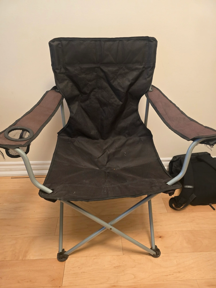 Portable camping chair, black fabric, grey metal frame. Cup holder on one armrest. Folds for easy storage and transport. Shows minor wear.