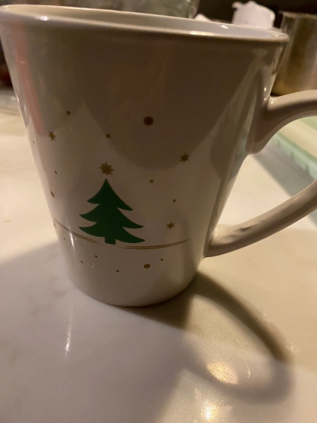 453White ceramic mug. Features a green Christmas tree and gold stars. Perfect for hot cocoa or coffee during the holiday season.#freecycle