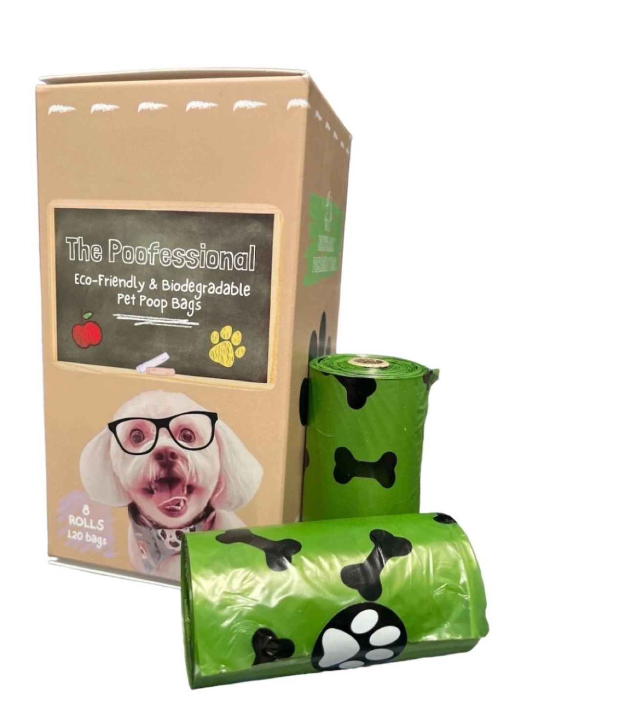 8 rolls of 120 eco-friendly and biodegradable pet poop bags. Green bags with bone and paw print designs. Perfect for pet waste disposal. 200 boxes available