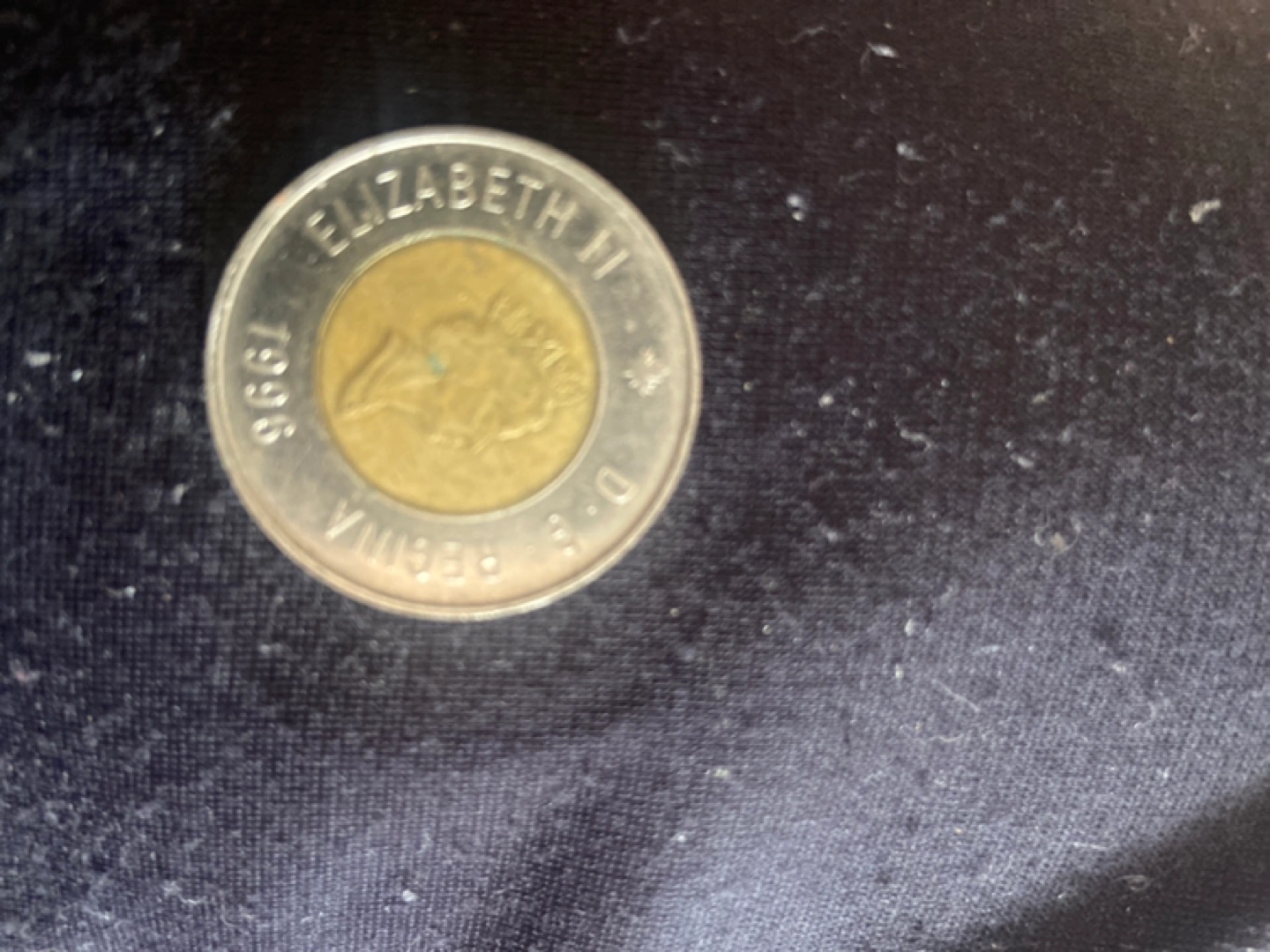 20Canadian two dollar coin. Features a polar bear on one side and Queen Elizabeth II on the other. Shows some wear.