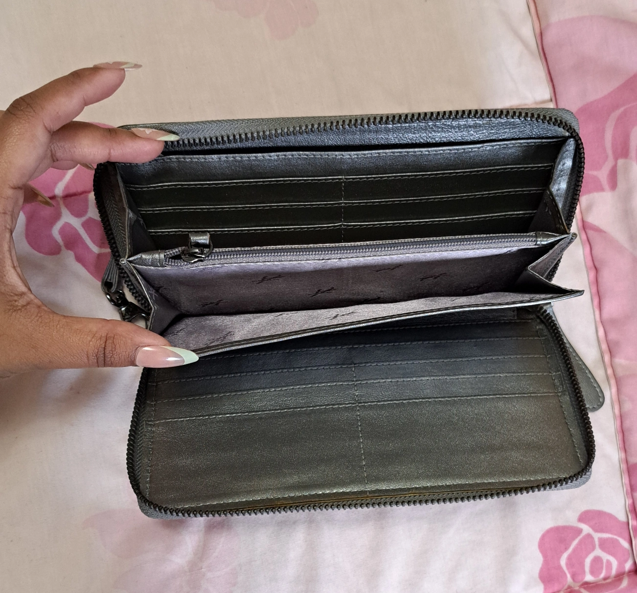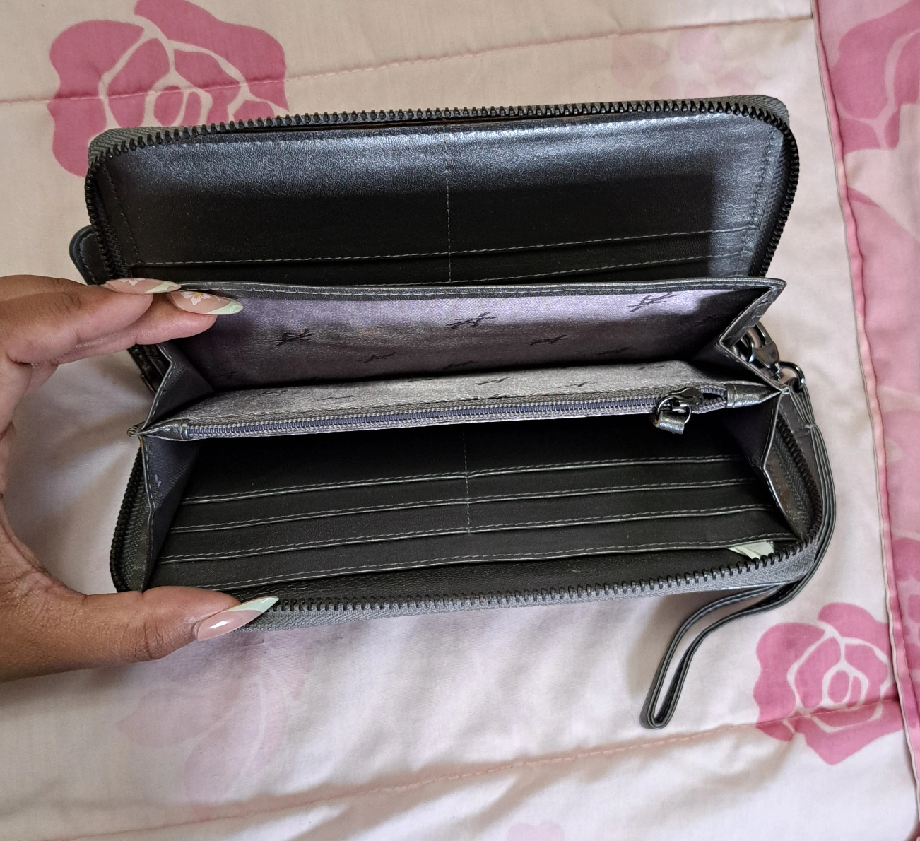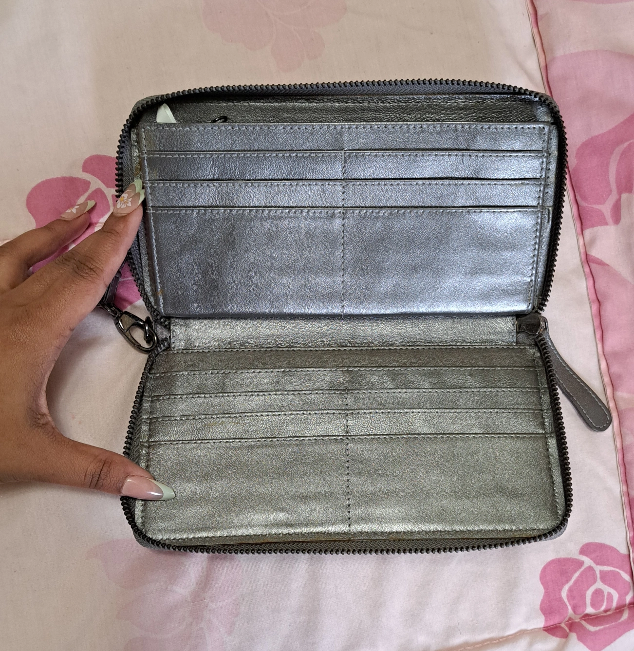 Stylish silver zip-around wallet. Multiple card slots and compartments. Wristlet strap included. Zipper closure.