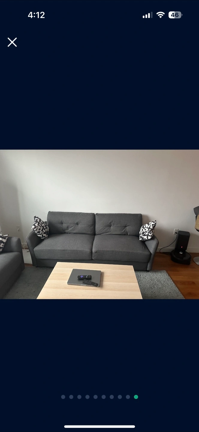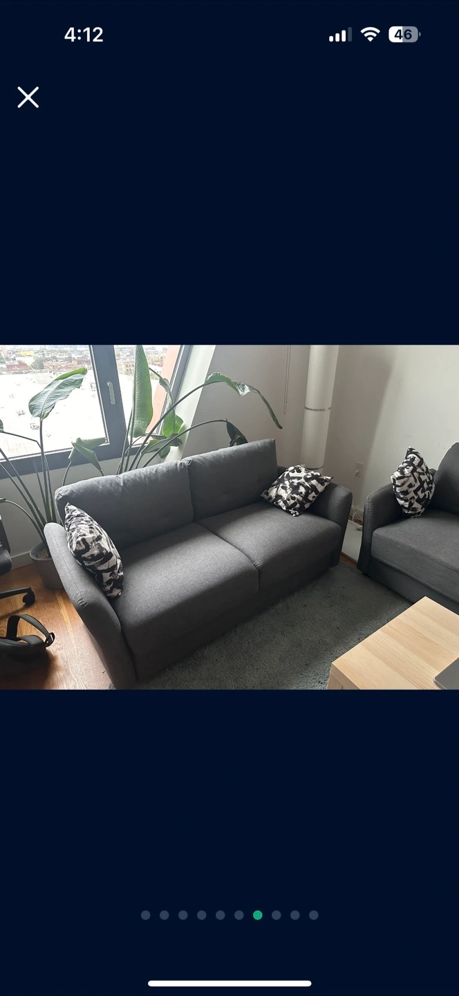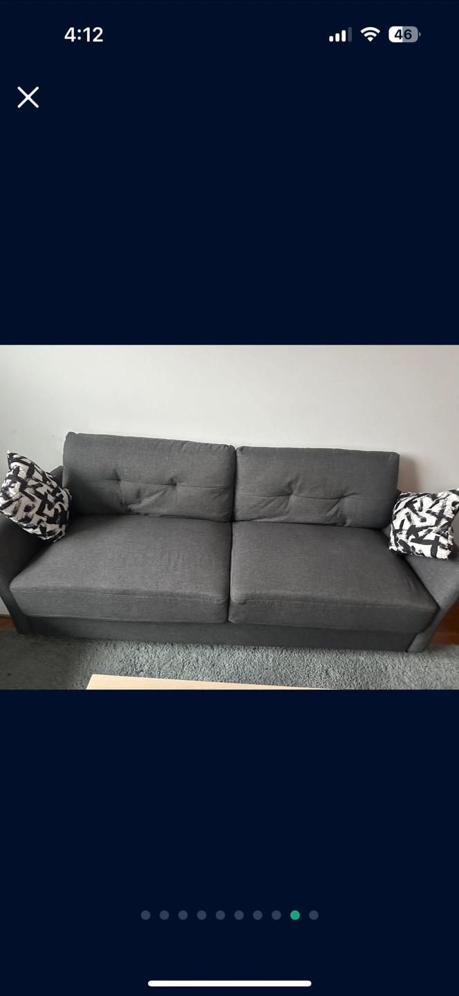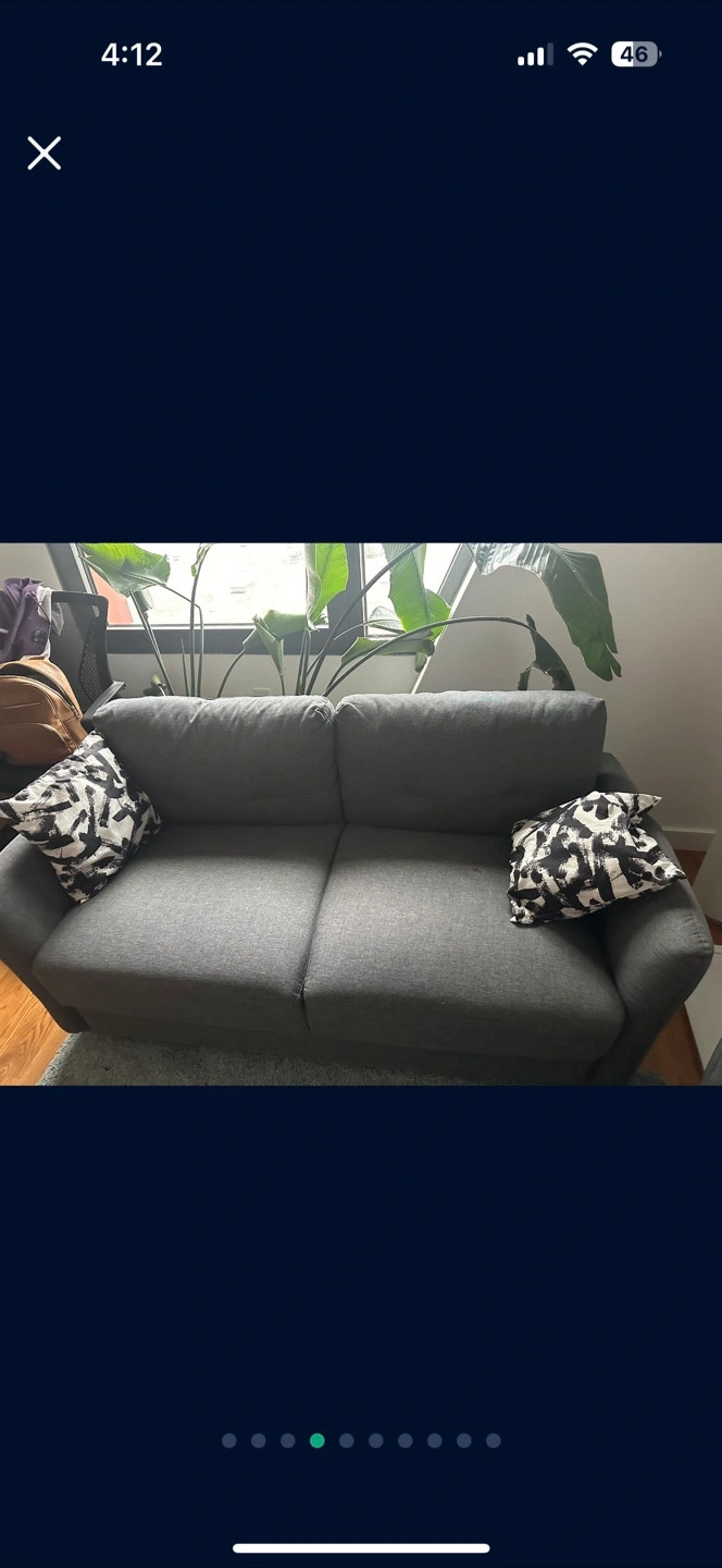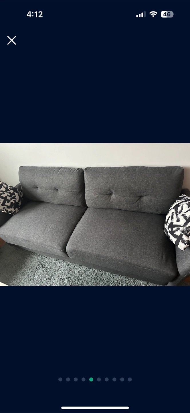 Grey fabric sofa and chair set. Two included decorative patterned pillows. No tears or stains, No pets, No kids home. Only one small heat stain on loveseat.