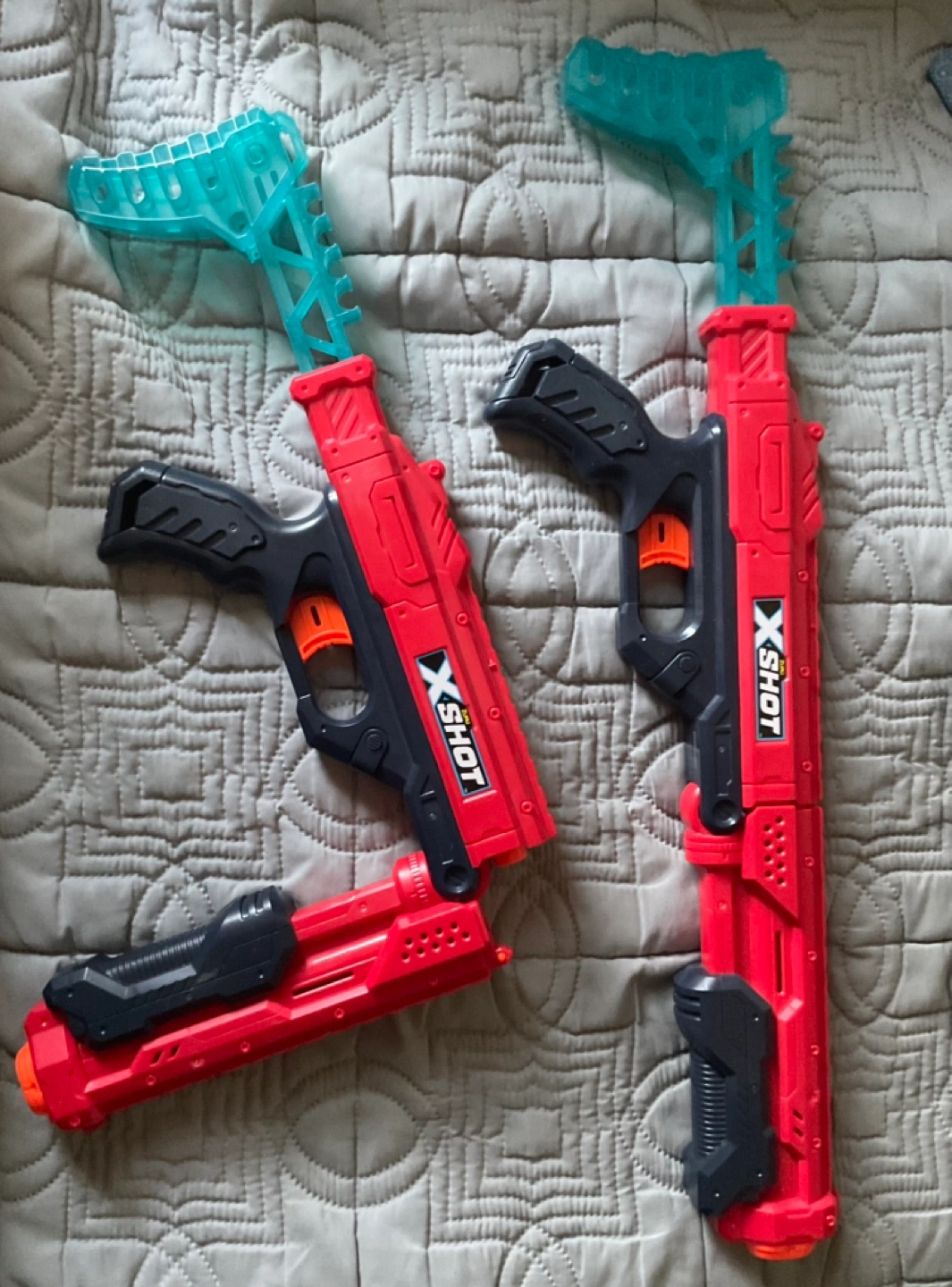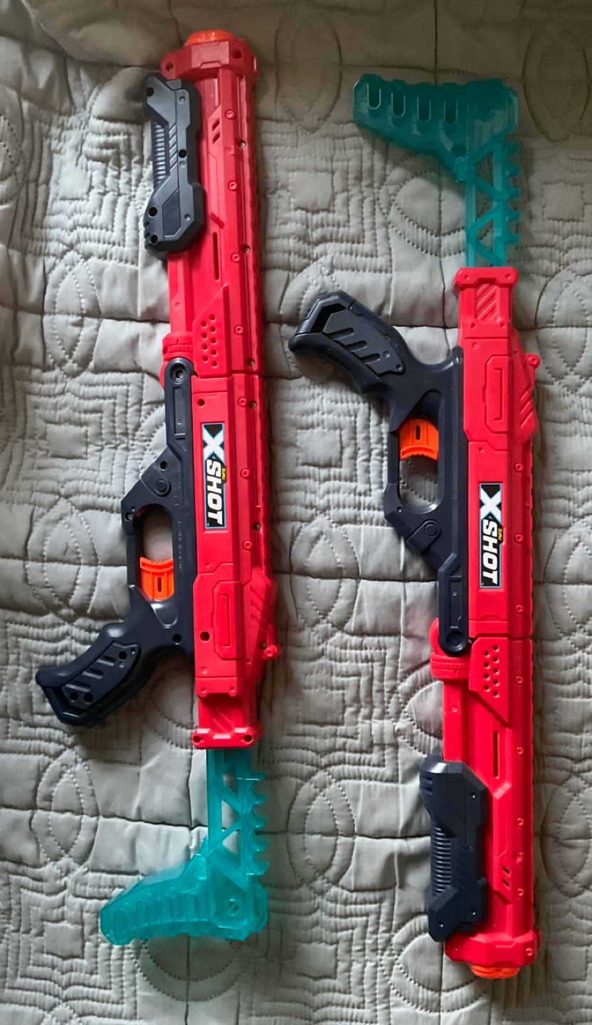 Two red and black X-ShotNerf guns. Long barrels and translucent blue stocks. Great for outdoor nerf fights. No foam bullets just guns