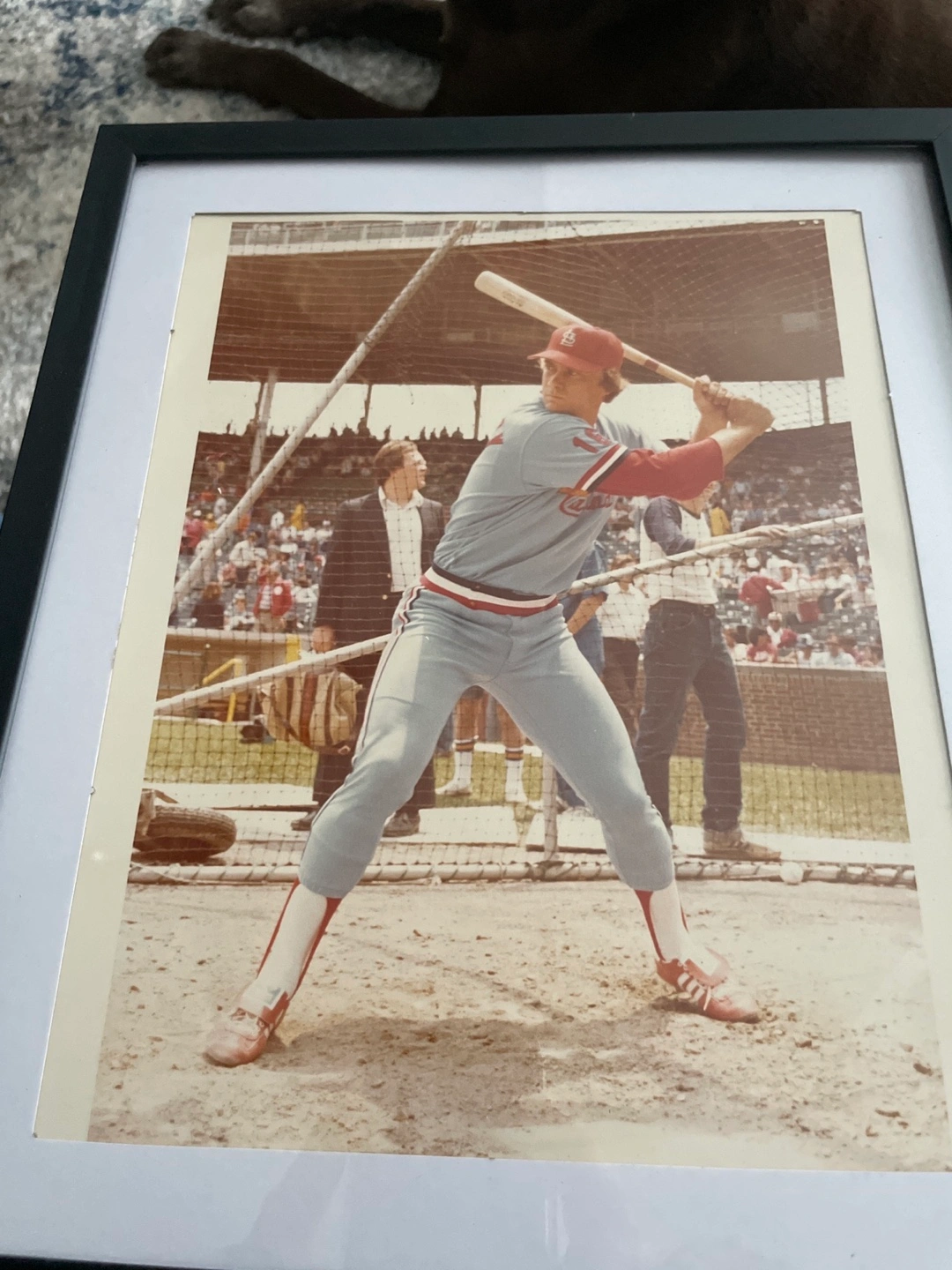 152Framed photo of a St. Louis Cardinals baseball player batting. Great vintage piece for any baseball fan. Photo shows player in action at the plate. Includes a matted frame. Terry Kennedy