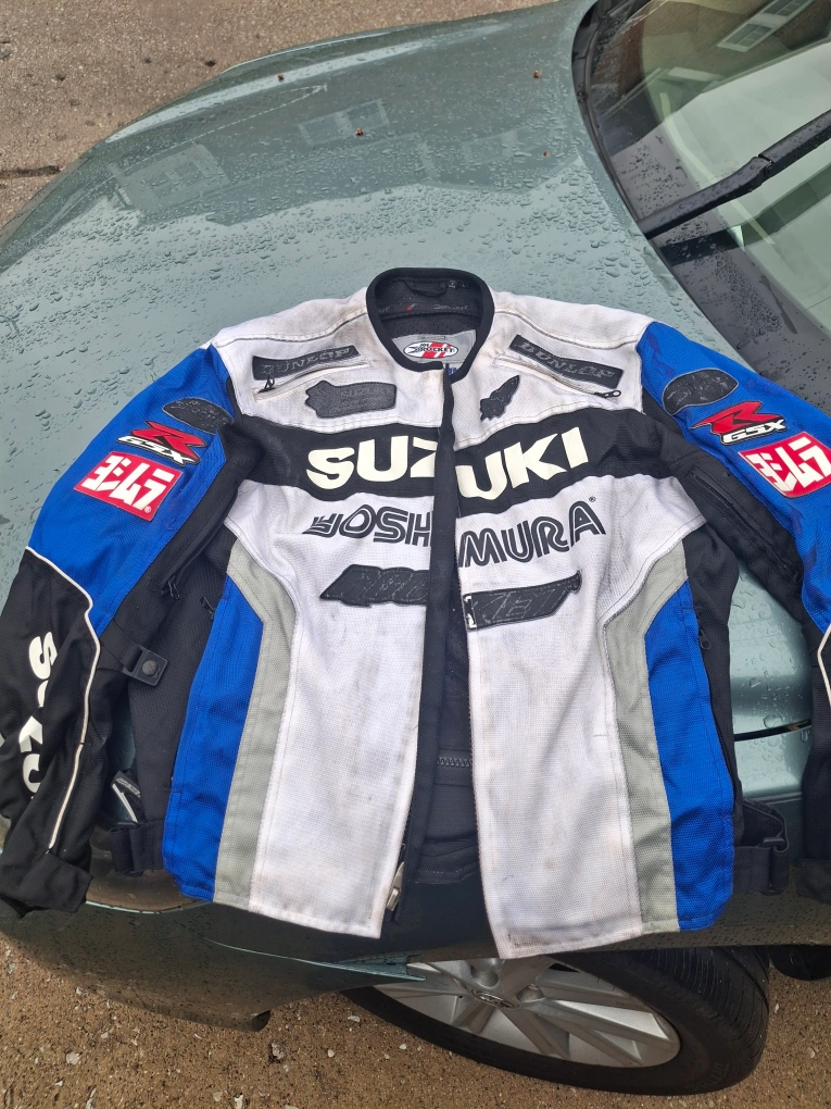 50Used Yoshimura racing jacket. Features Suzuki and GSX-R branding. Blue, white, and gray. Zipper closure. Shows wear. large