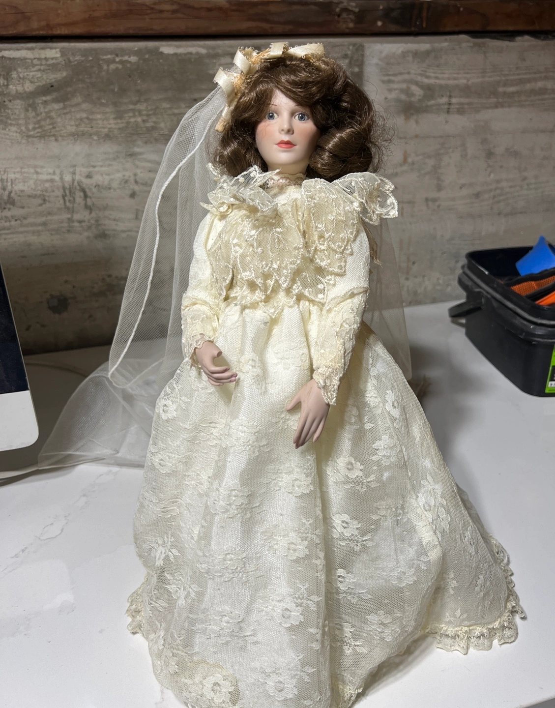 Beautiful porcelain bride doll. Long flowing wedding dress. Lace accents. Brown hair. Veil included. Display stand included.