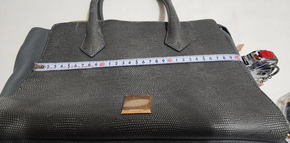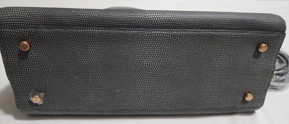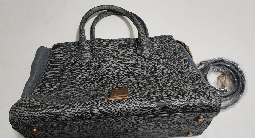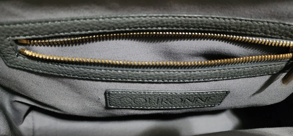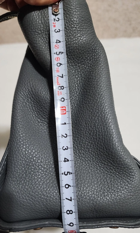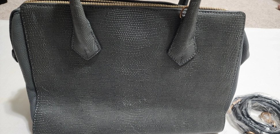 This is a Couronne grey cowhide leather handbag with a shoulder strap. It features gold hardware and has some minor scuffs on the exterior, but overall, it is in very good condition. The lining is in excellent condition, and the bag is in great overall shape.