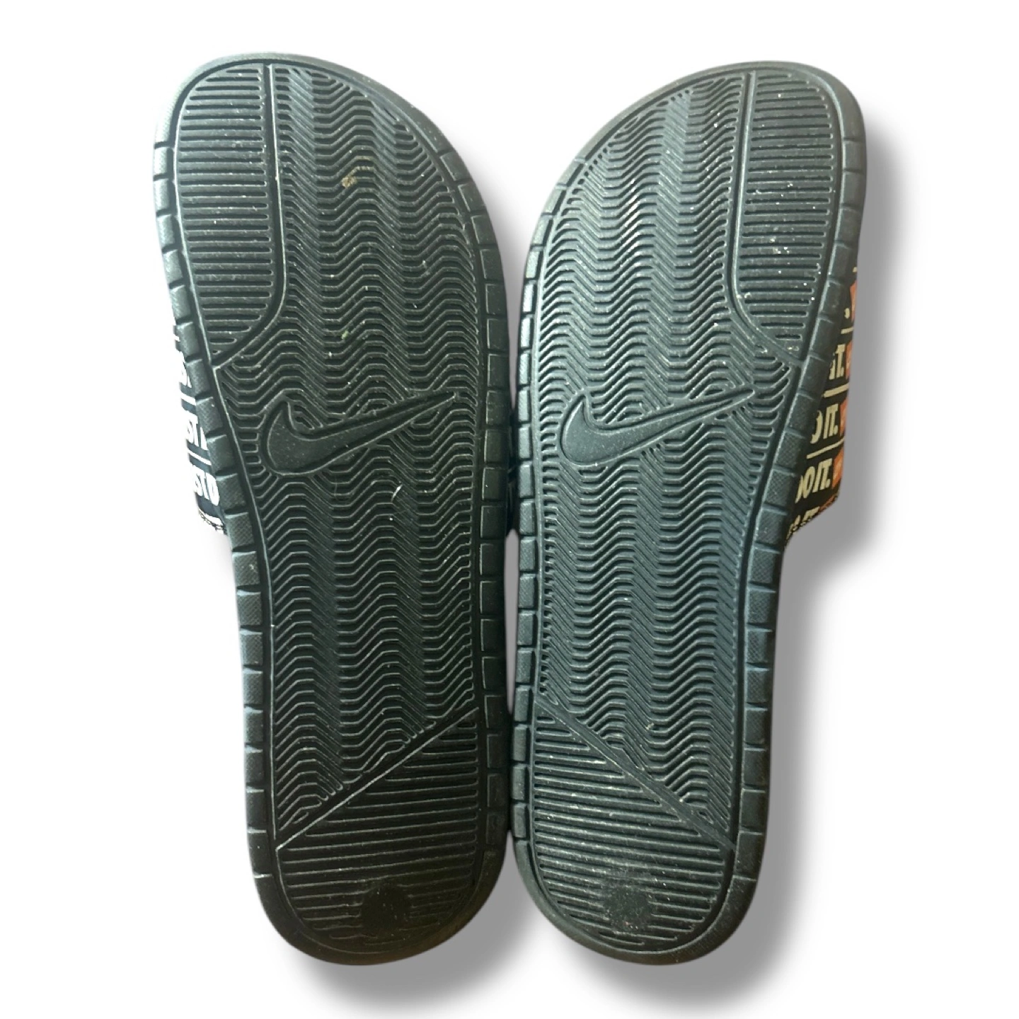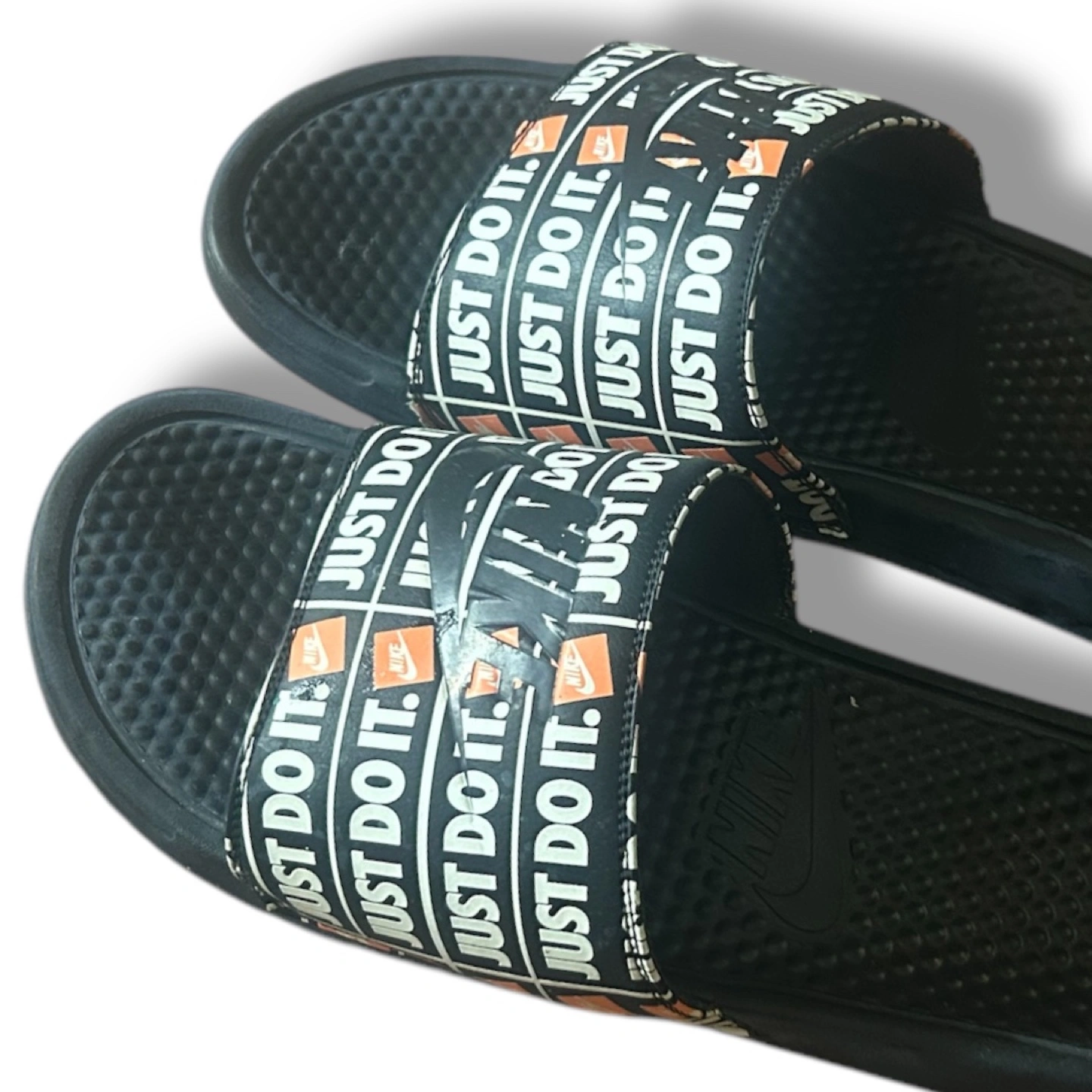 136Men's Nike Benassi slides. Black with orange and white Just Do It print. Comfortable and stylish summer footwear. Used in good condition! US Men’s 14