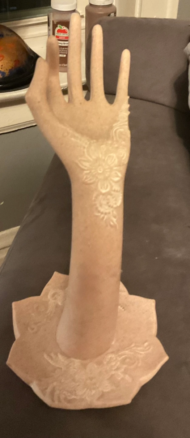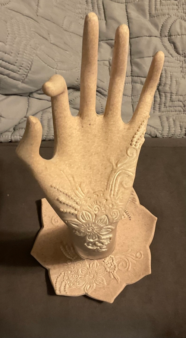 Brand New BEAUTIFUL HENNA HAND Excellent Condition COLOR : CREAM & WHITE DIMENSIONS : 6W X 13H a hand DESIGNED with INTRICATE HENNA detailing. Rests on a LOTUS shaped base. ALSO with HENNA DESIGN Perfect for jewelry display. OR USE AS HOME DECOR