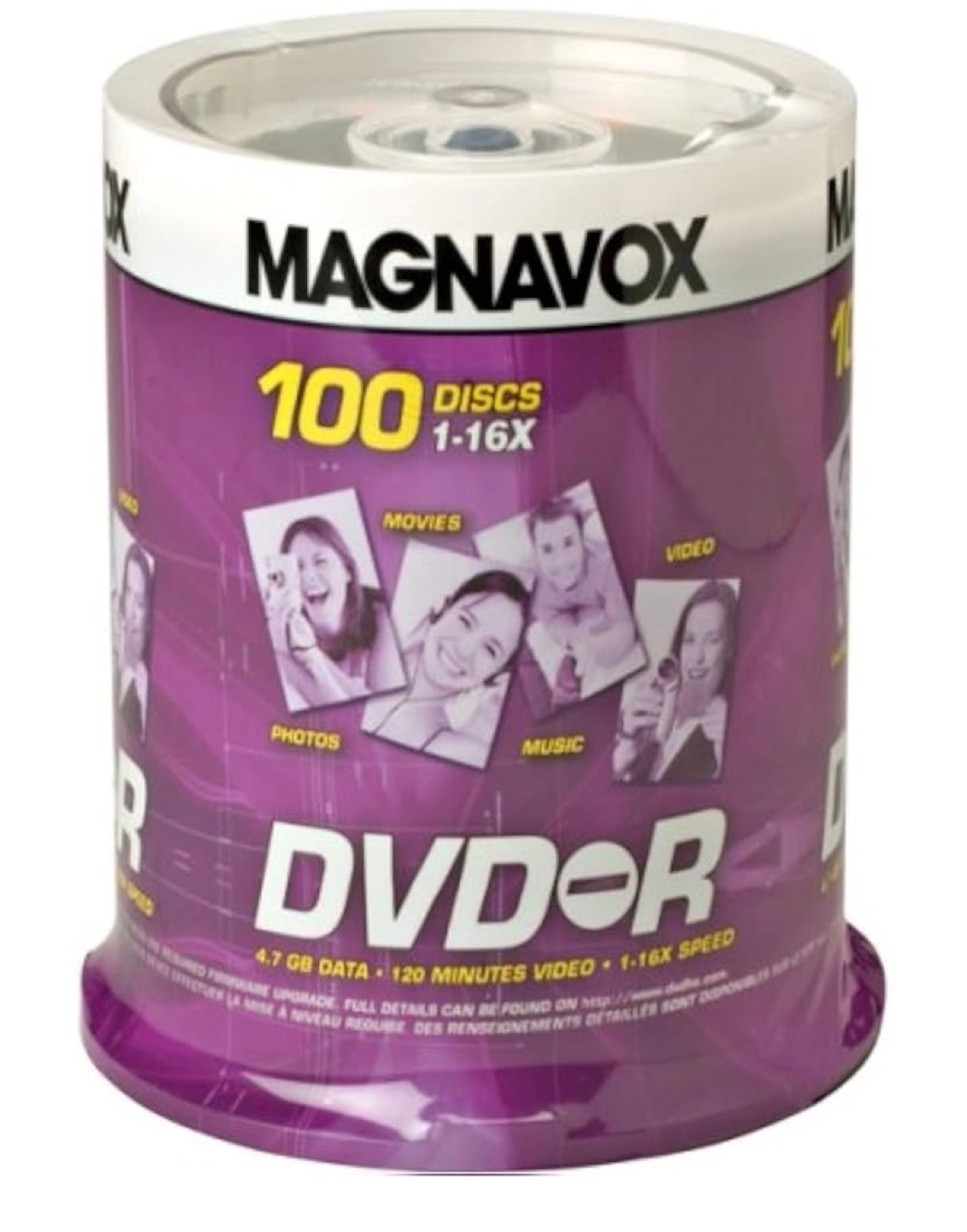 86Product specifications 100 count Brand Magnavox Item Weight 3.2 Pounds Memory Storage Capacity 4.7 GB Format DVD-ROM Write Speed 16x Recording Capacity 120 minutes Manufacturer MAGNAVOX UPC 026616025862 Cash and pickup deal only. I am near Myrtle and Wyckoff Aves, Brooklyn.