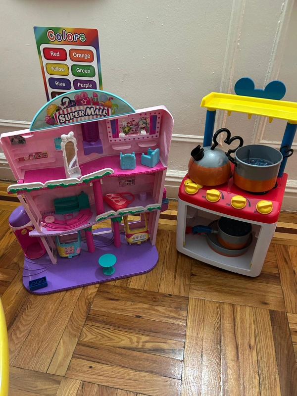 Two cute playsets for imaginative play. Pink multi-level Super Mall includes shops and vehicles. Mickey Mouse-themed kitchen features stove and cookware. Great for kids.