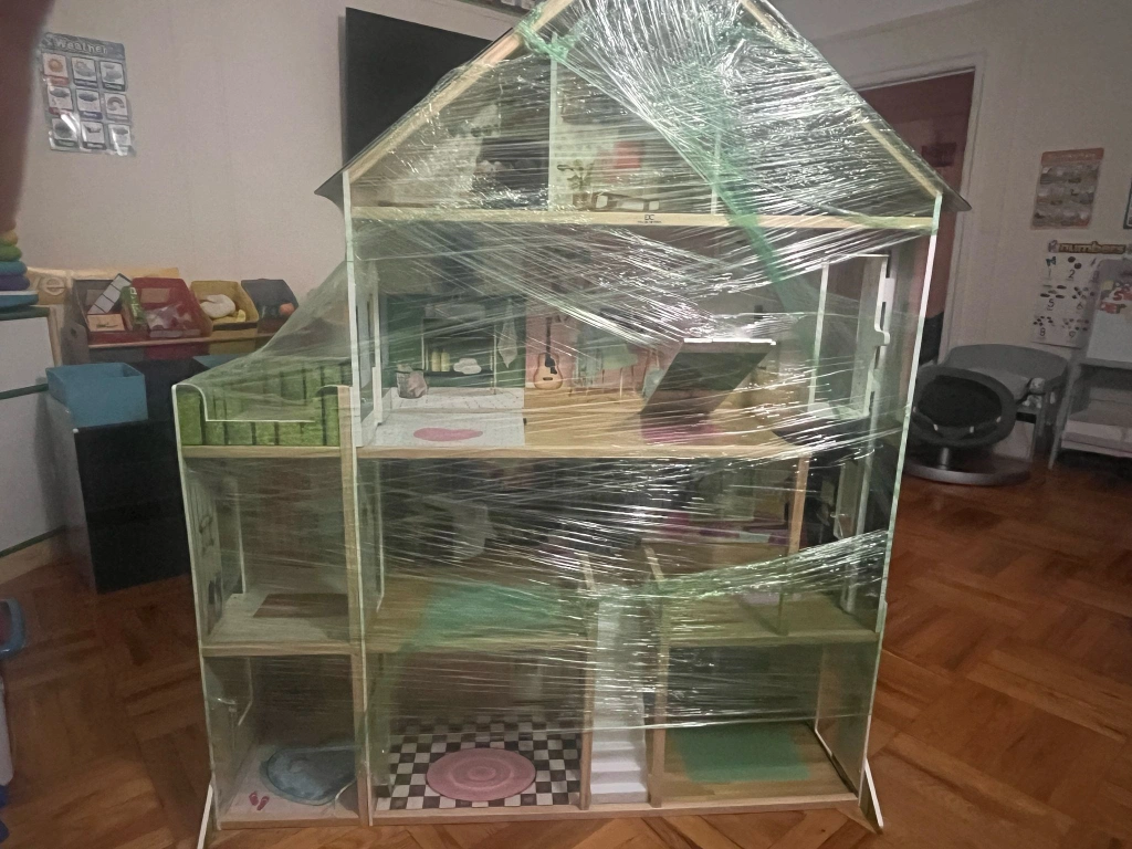 20Large multi-story dollhouse. Wooden construction. Wrapped in plastic wrap. Includes furniture. one small corner is folded.