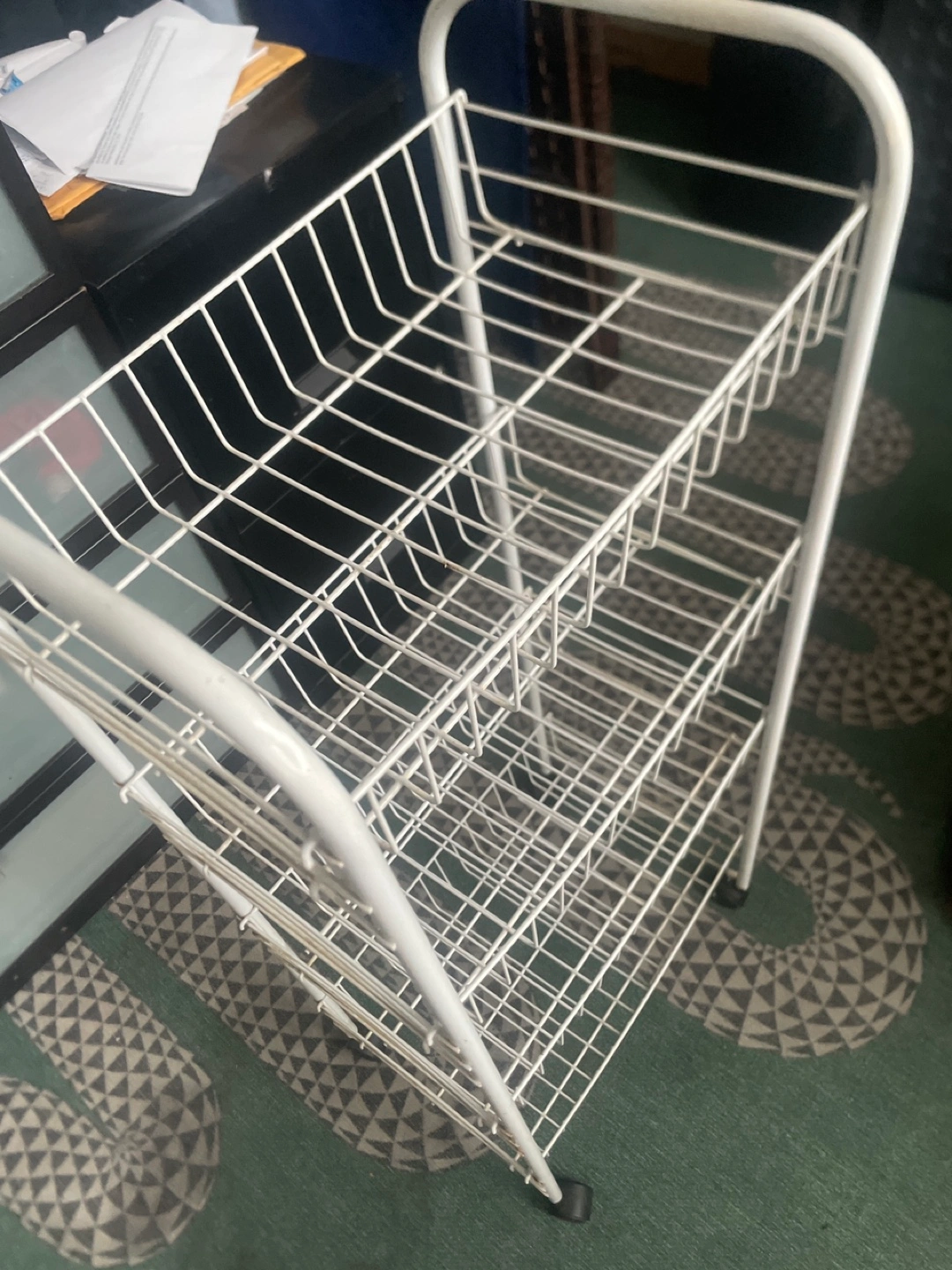 151Metal wire shelving unit with wheels Three tiers, white frame. Wheels for easy mobility. Great for storage, organization.