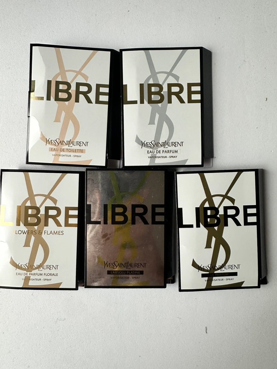 1000+Set of 5 Yves Saint Laurent Libre perfume samples. 1.2ml, Includes: Libre Eau de Toilette, Libre Eau de Parfum, Libre L'Absolue Platine Libre Flowers & Flames Libre Le Parfum Perfect for trying before committing to a full-size bottle.
