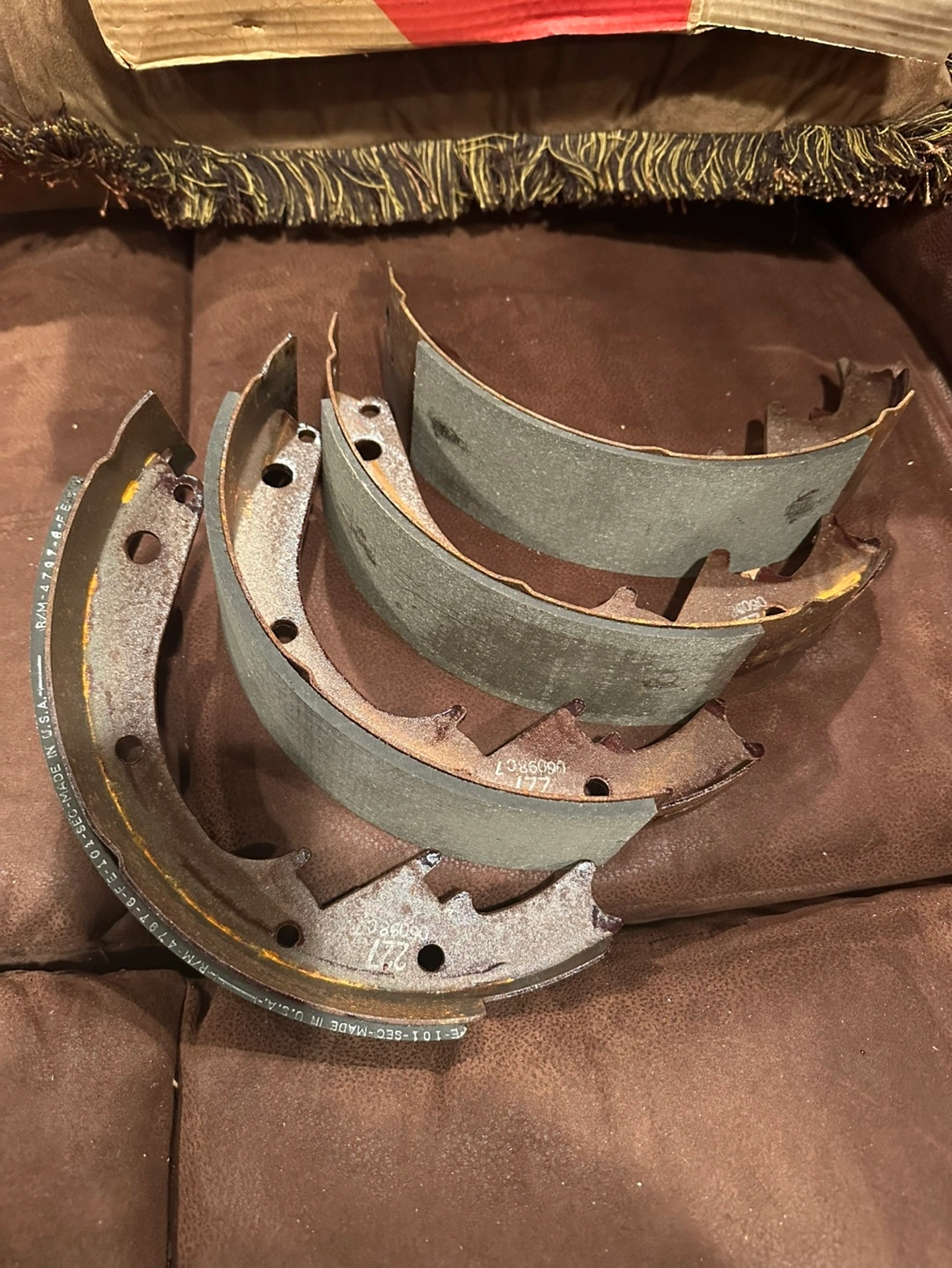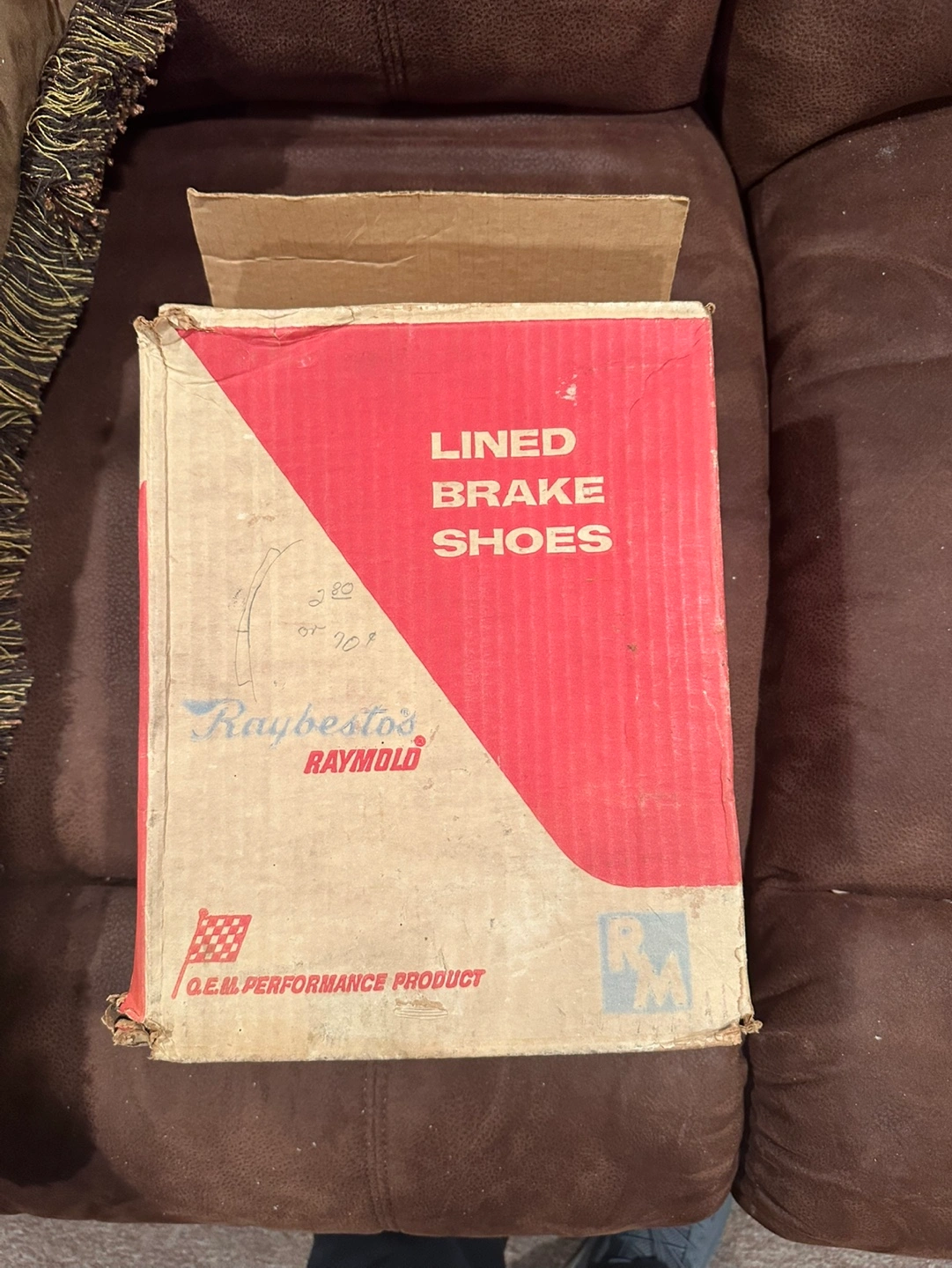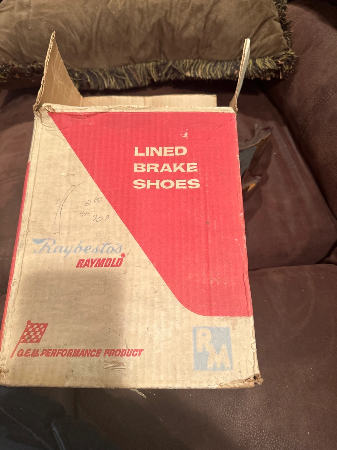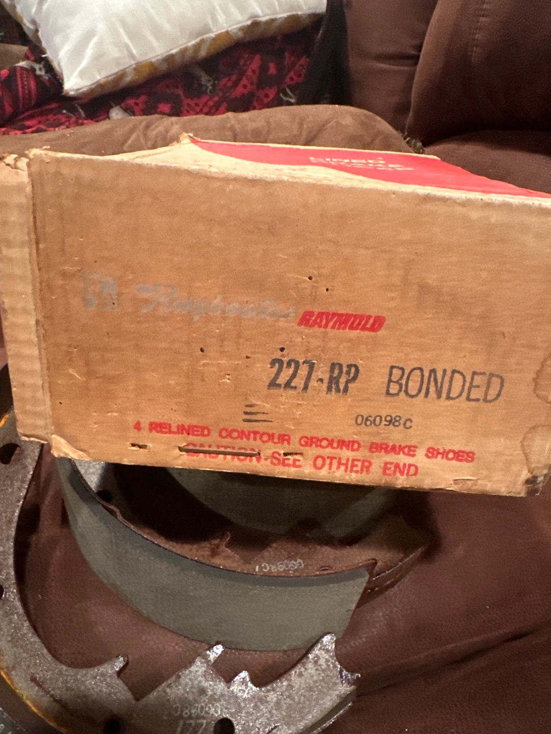 NOS vintage Raybestos Raymold brake shoes. Four relined contour ground brake shoes in original box. Part number 227-RP. O.E.M. perfor