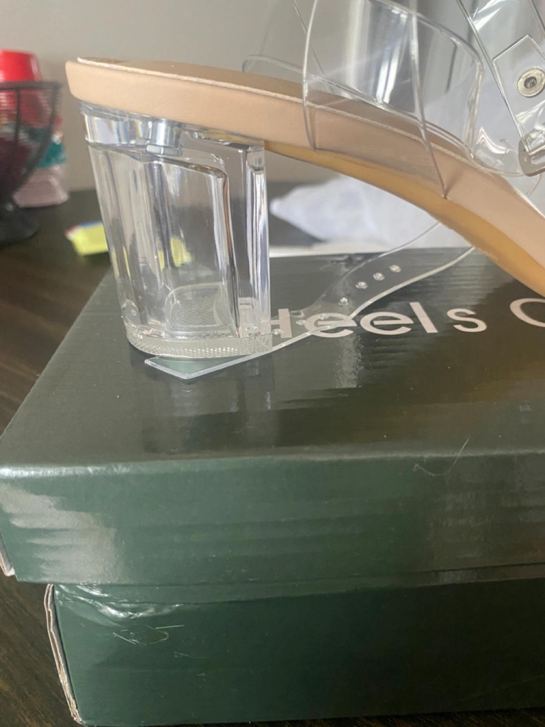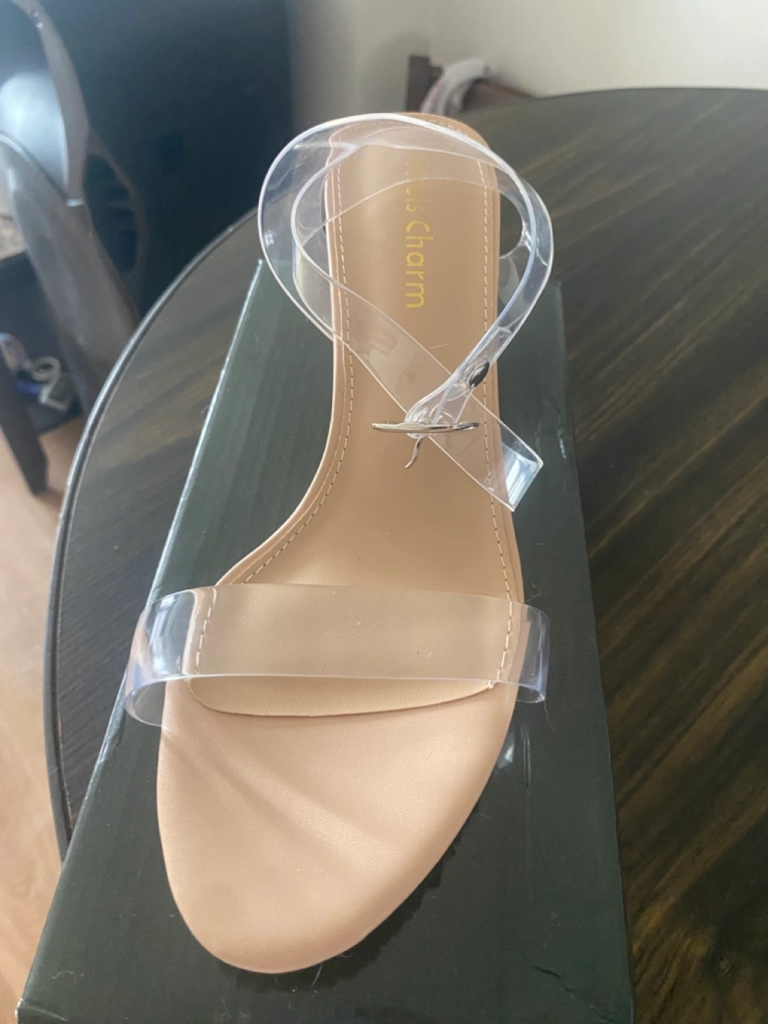 Brand new, never worn. Beige and clear sandals with ankle strap. Clear block heel. Size 8.5. Comes in original box.