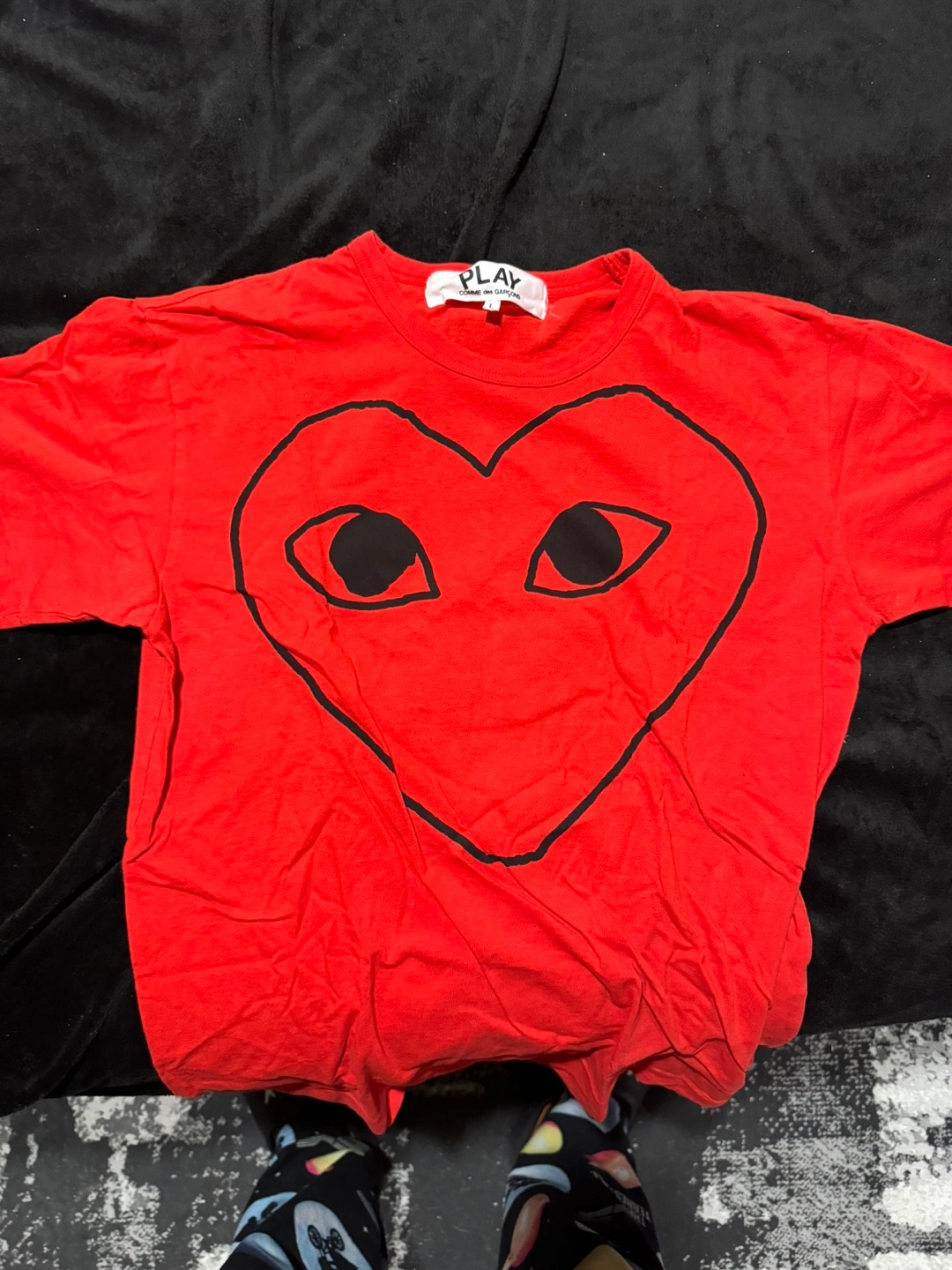 Red short sleeve t-shirt. Features a black outlined heart with eyes graphic. Crew neck.