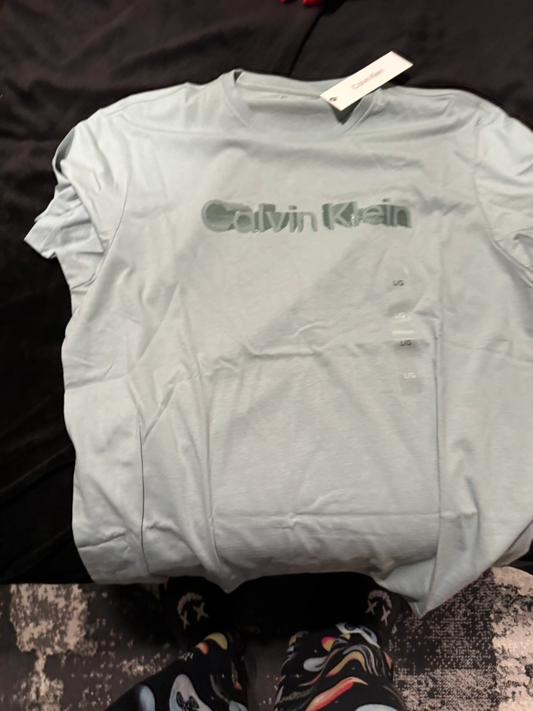 Men's short sleeve crew neck t-shirt. Light green color. Calvin Klein logo on the chest. Size Large.