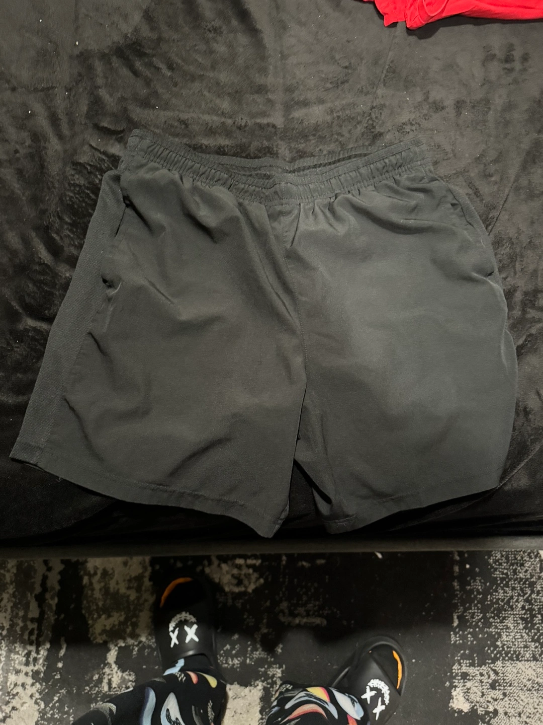 Black athletic shorts. Elastic waistband. Side pockets. Lightweight material. Good for working out or casual wear.
