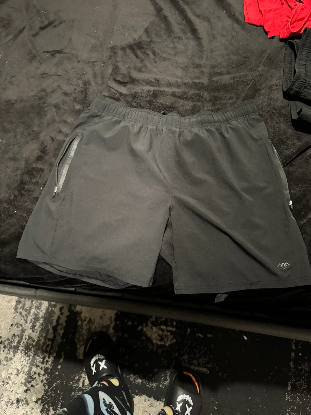 Black athletic shorts. Side pockets. Elastic waistband. Lightweight material. Great for workouts or casual wear.