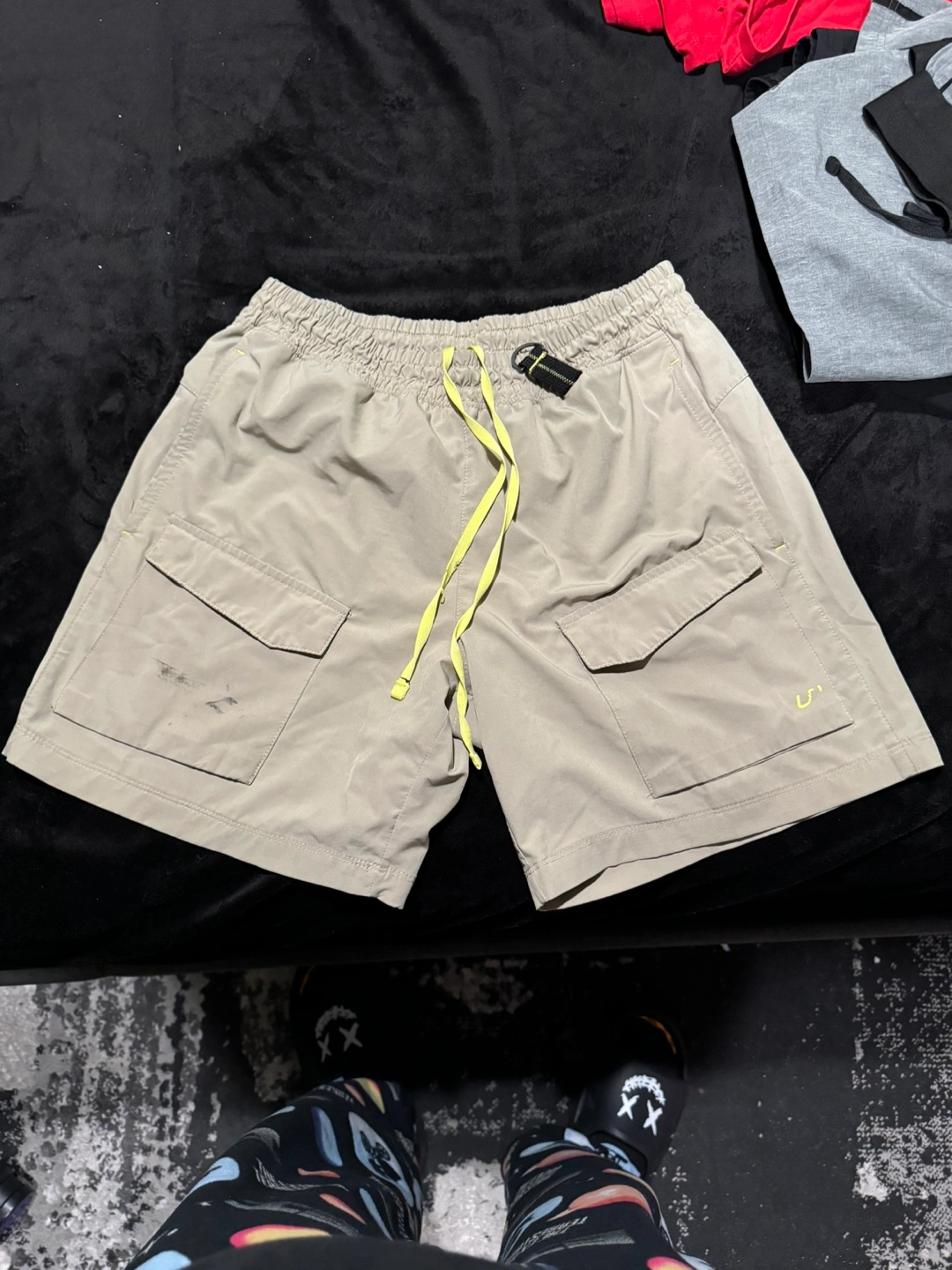 Lightweight cargo shorts. Drawstring waist. Multiple pockets. Good for summer.
