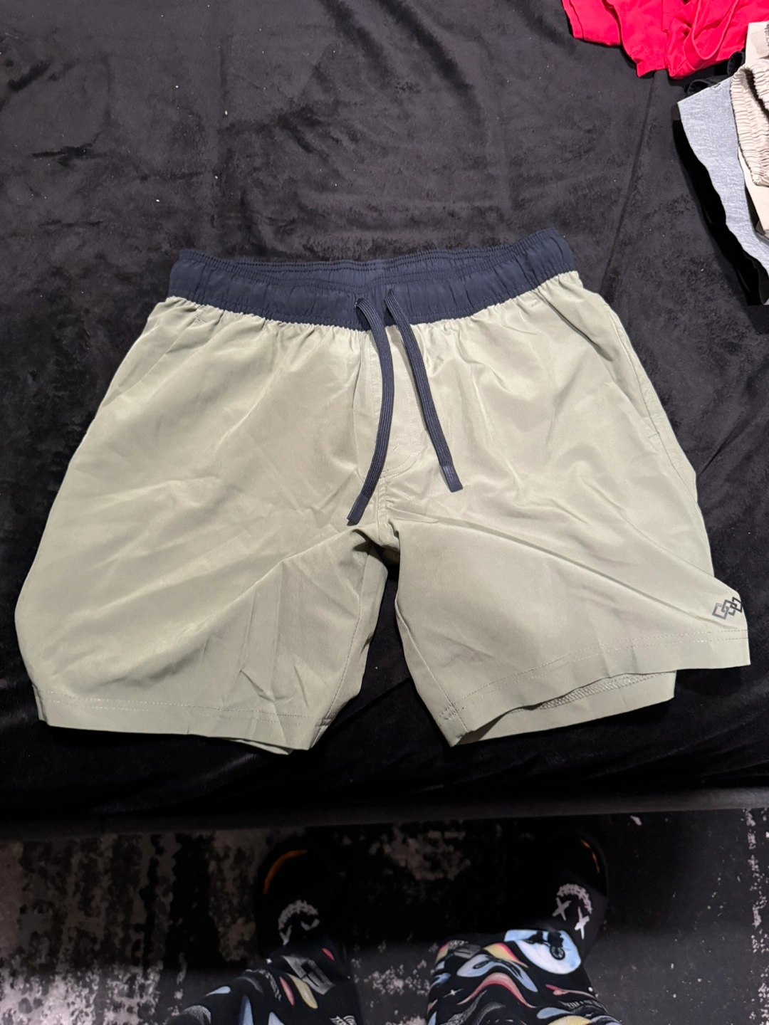 Men's athletic shorts. Olive green with black waistband. Drawstring closure. Lightweight material.