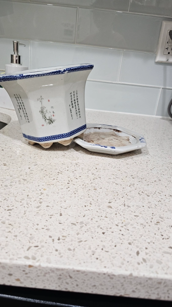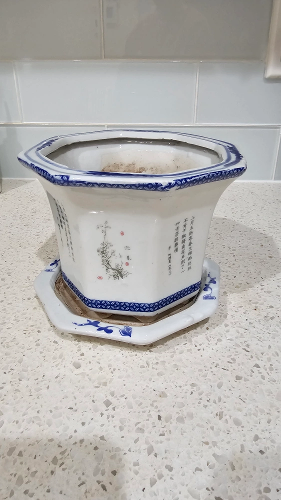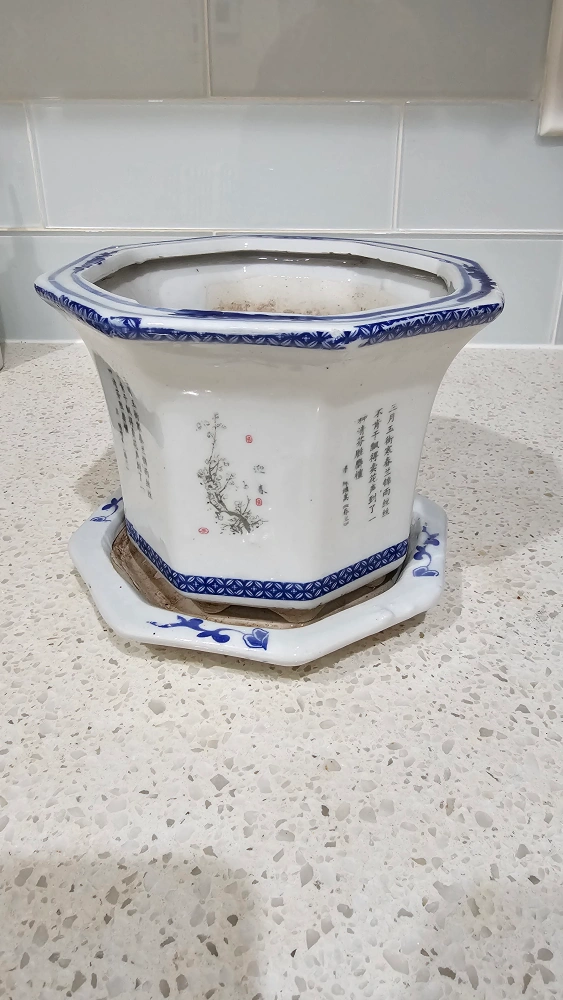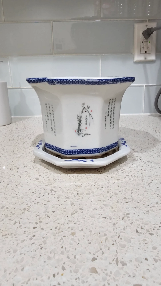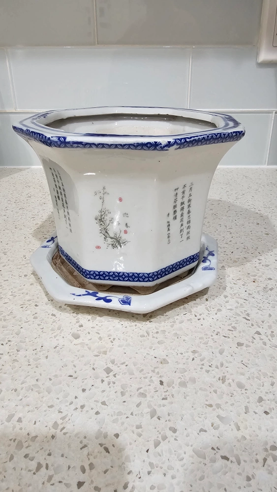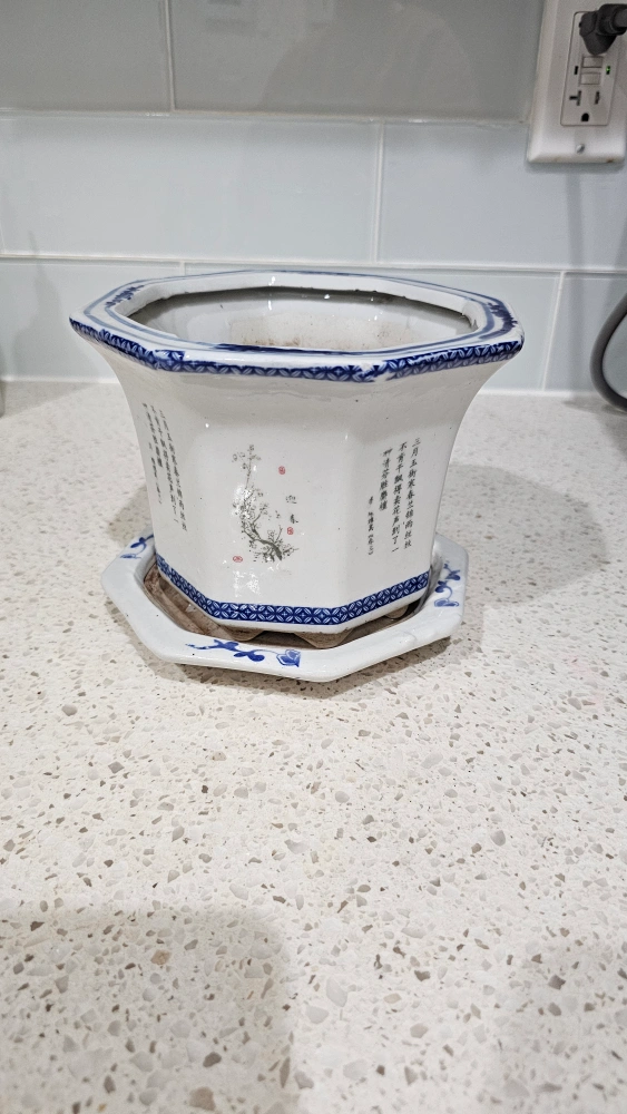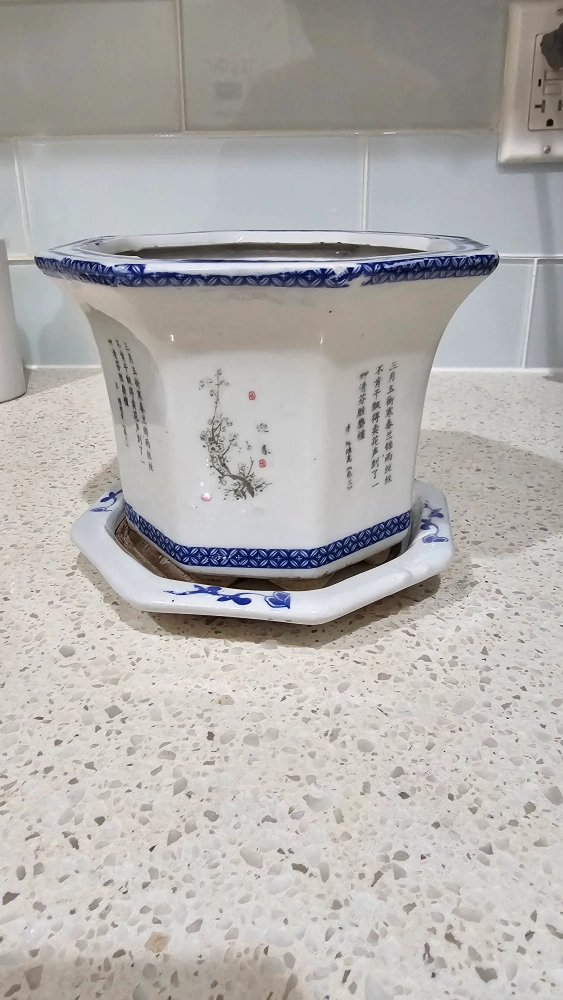 365Beautiful porcelain planter. Octagonal shape. Blue and white design. Includes matching saucer. Perfect for plants or decor. porcelain, ceramic