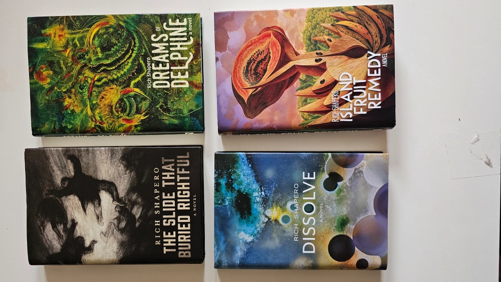 365Set of four novels by Rich Shapero. Includes Cold Wakes Up the Fire Inside, Forces We Can't See, Season of Facts, To Find a New Life, The Slide That Buried Rightful, and Dreams of Delphine. Paperback books. Great condition. it's new. it was gift. never used.