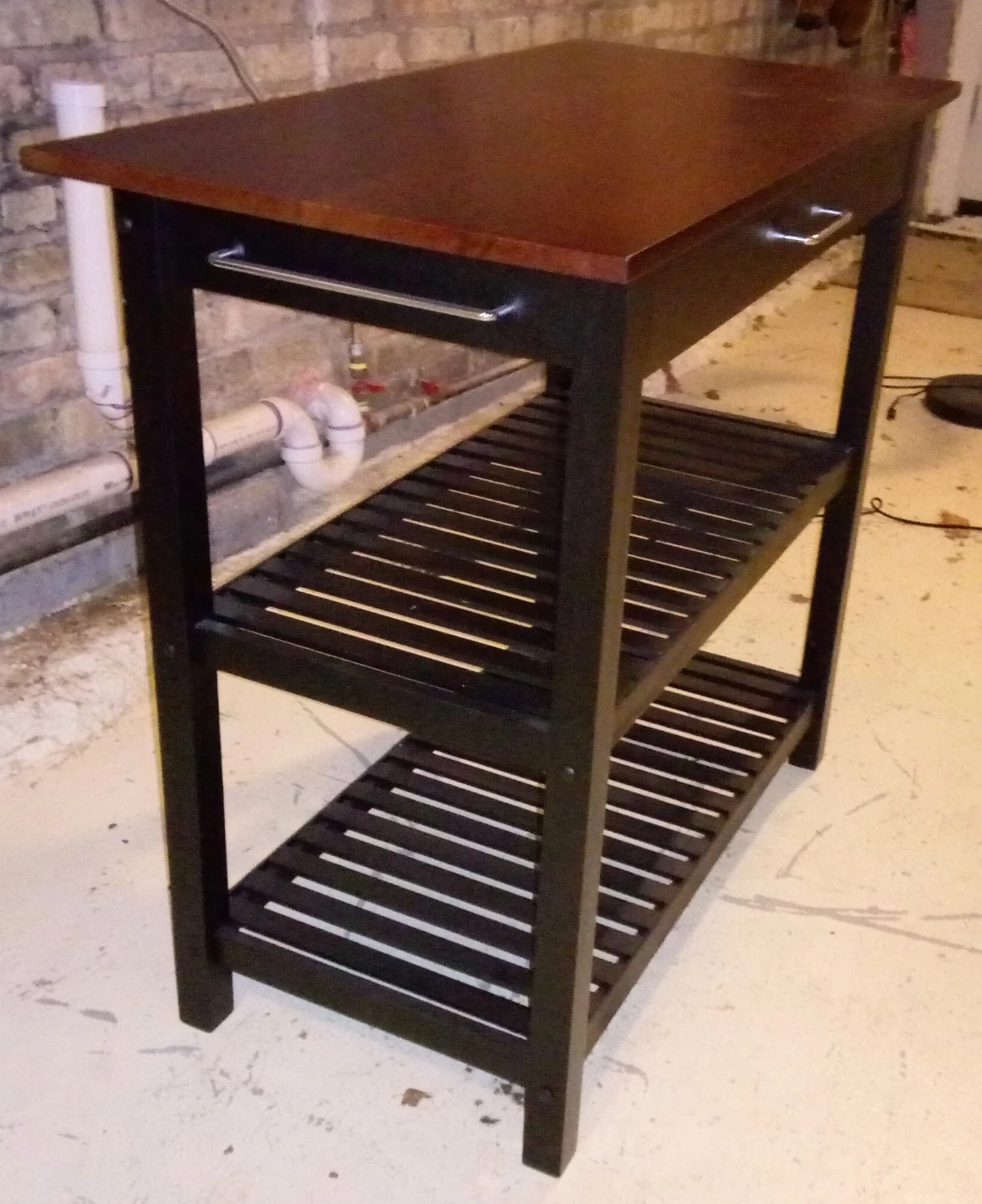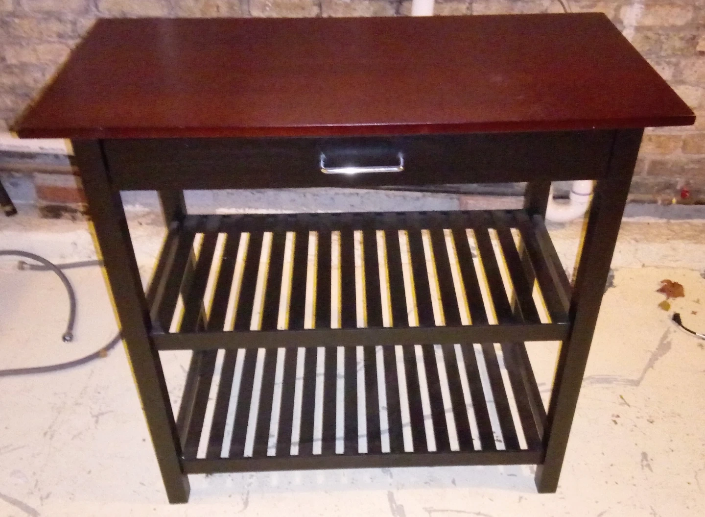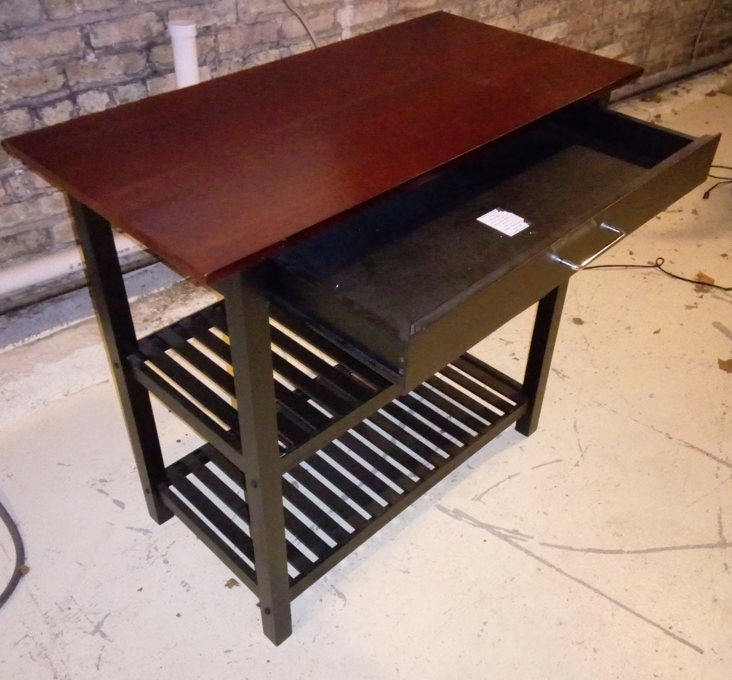 Black and walnut kitchen island. Dark wood top. One drawer. Two slatted shelves. Good for kitchen storage or prep.