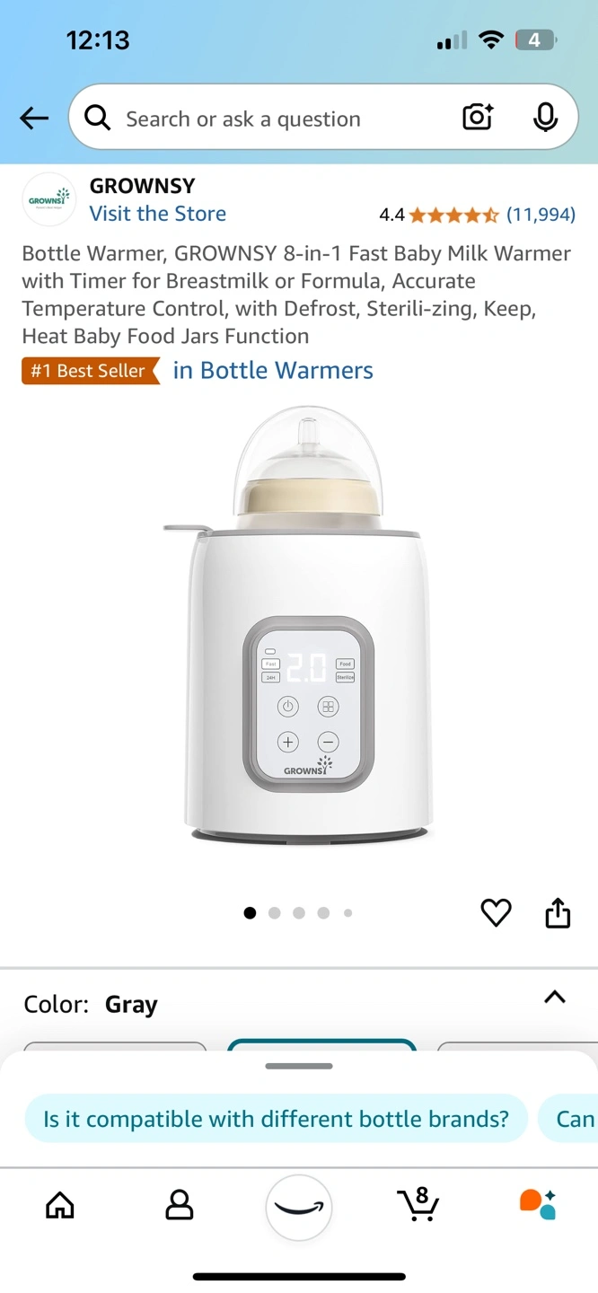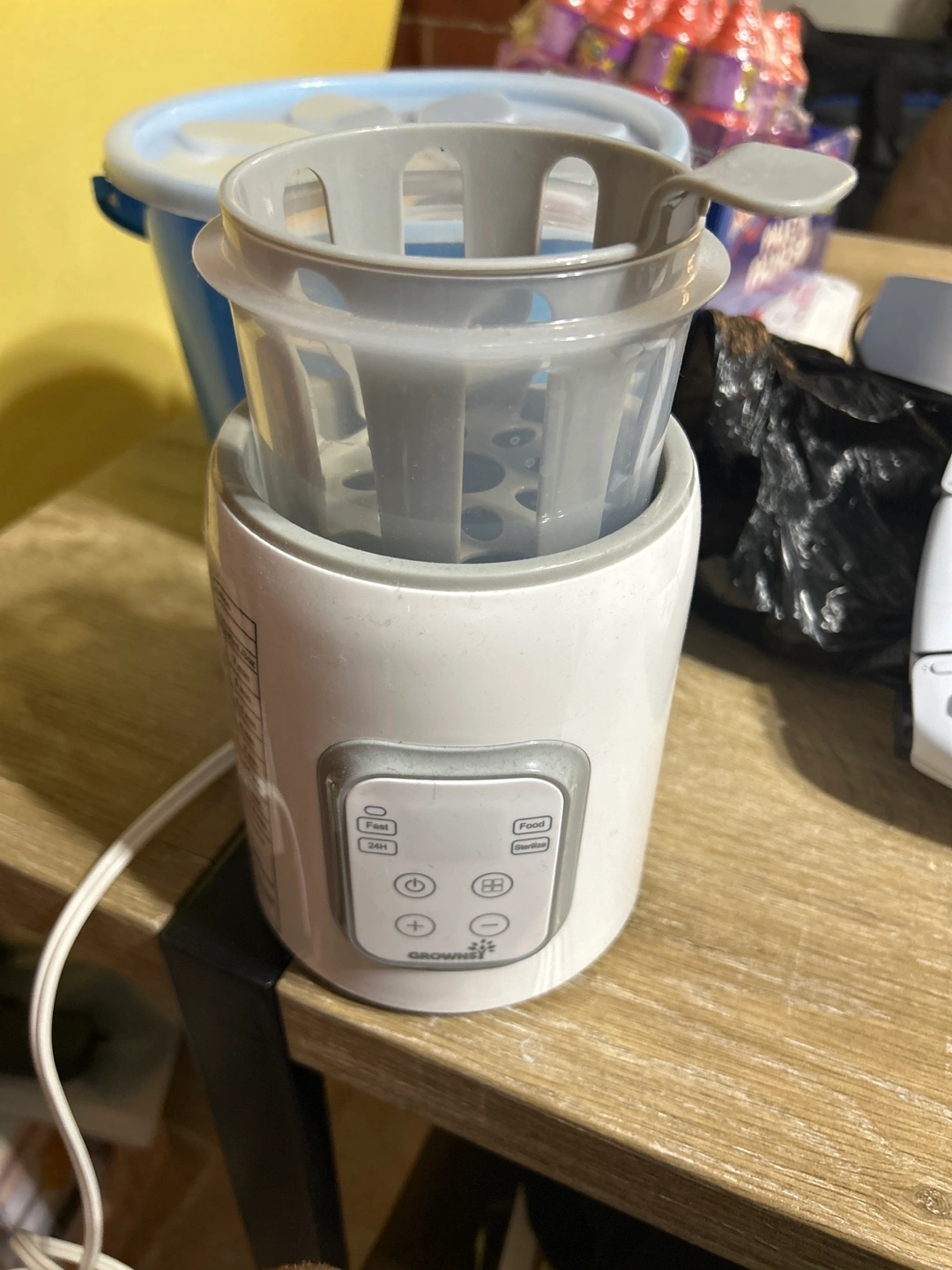 Baby bottle warmer. Gray. Features timer, temperature control, defrost, sterilizing, and jar warming functions.
