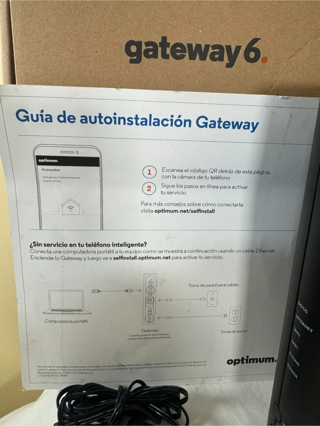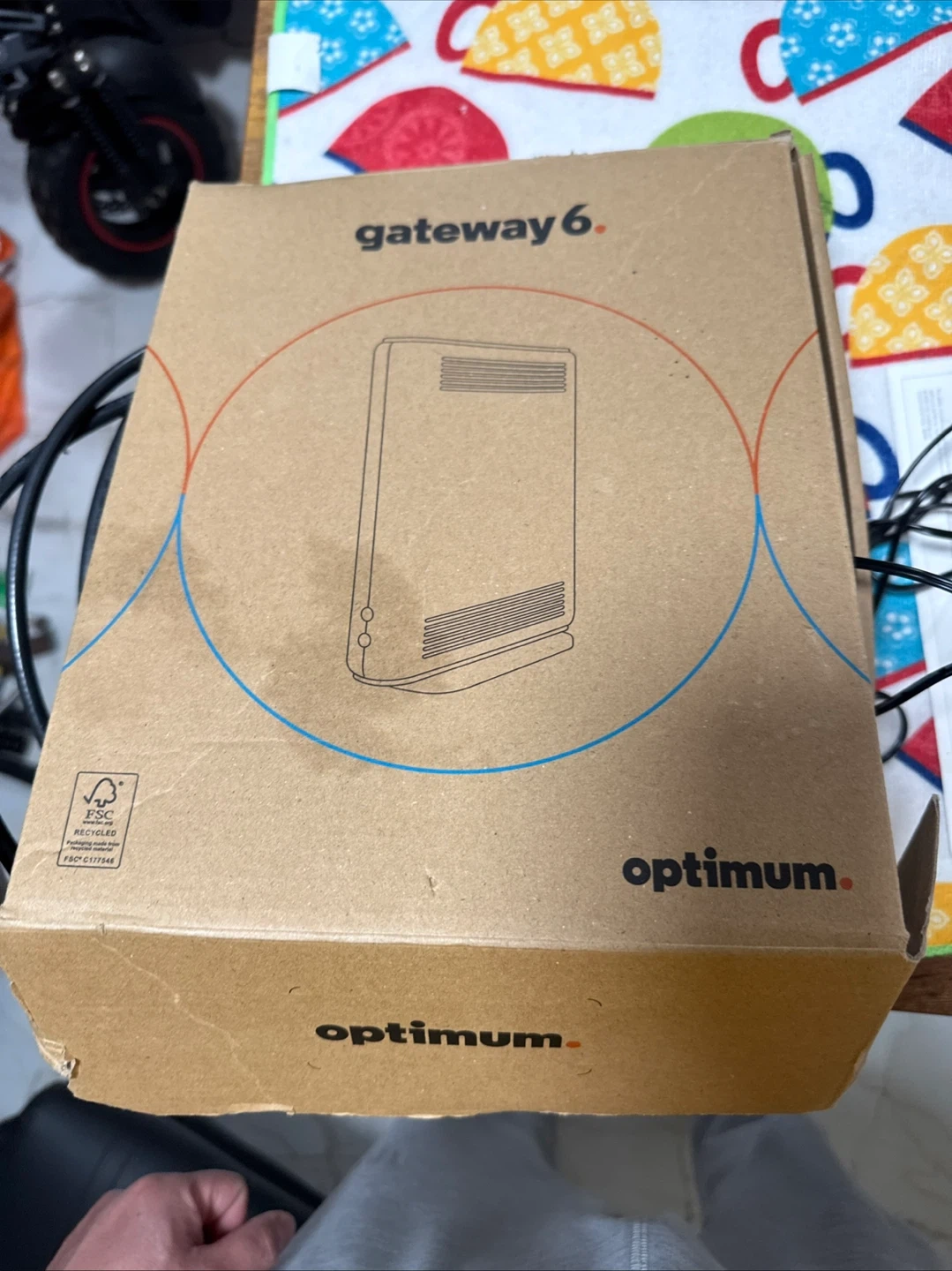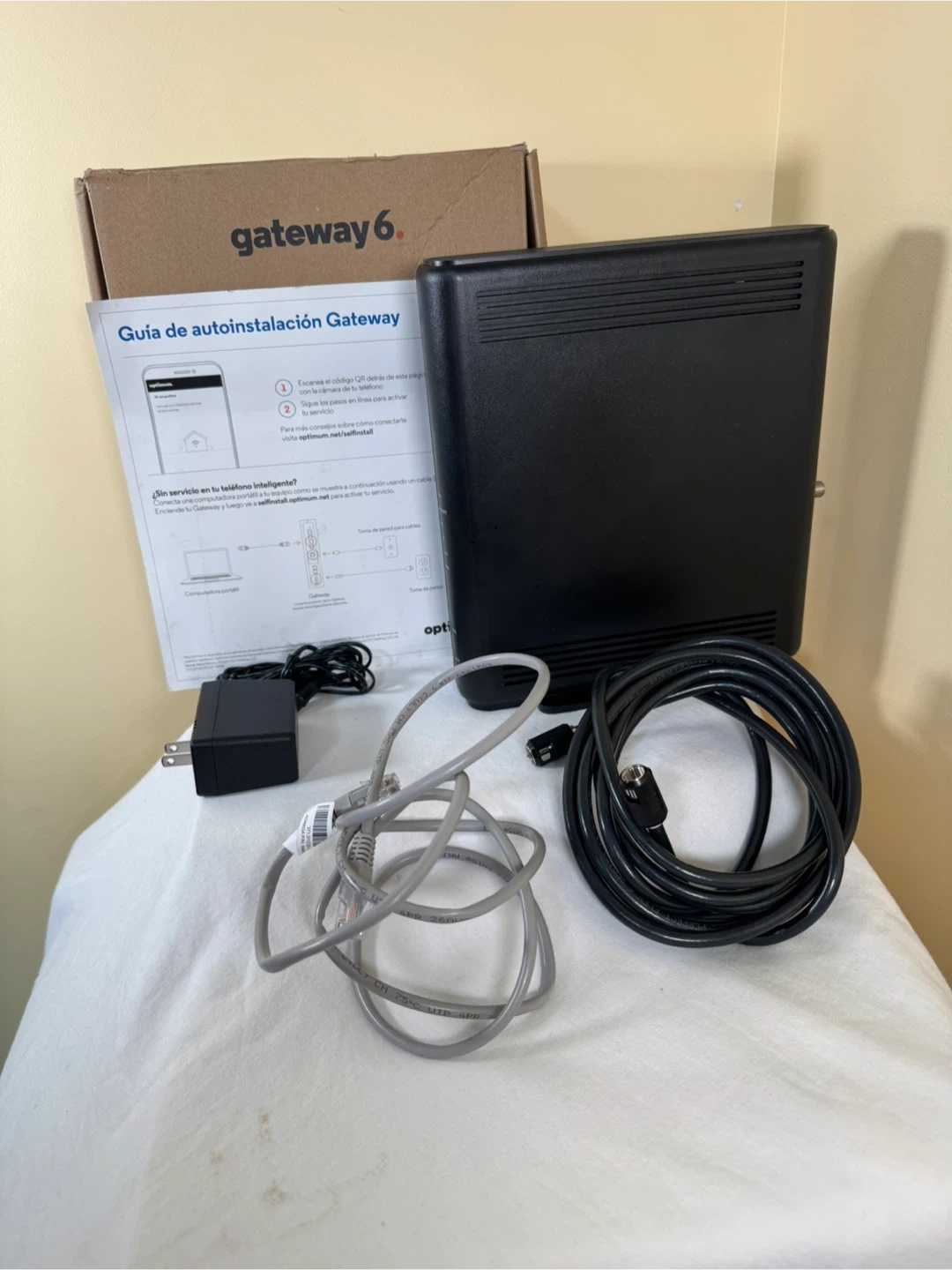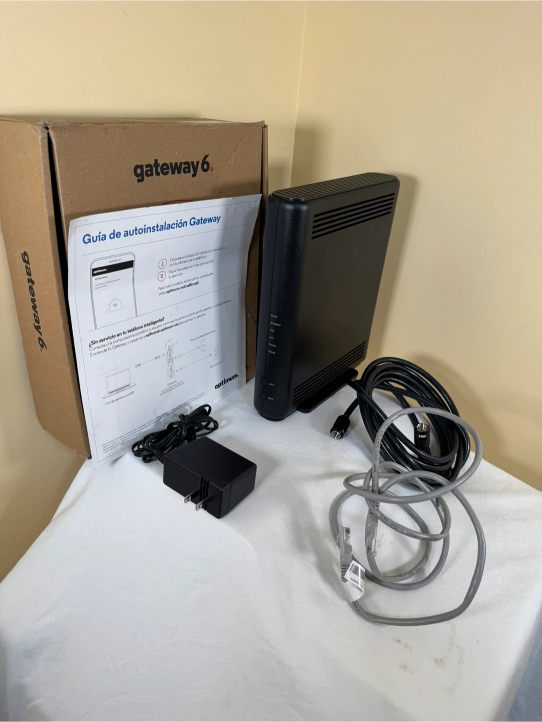 This is an Optimum Gateway 6 router. It comes with its original box, power adapter, and Ethernet cables. Includes an installation guide to help get you set up. Perfect for home internet service!