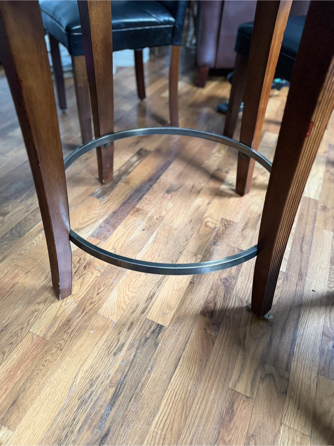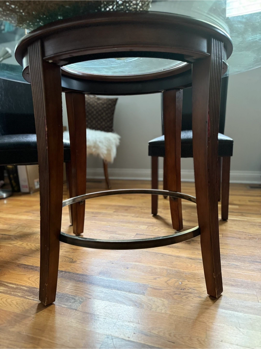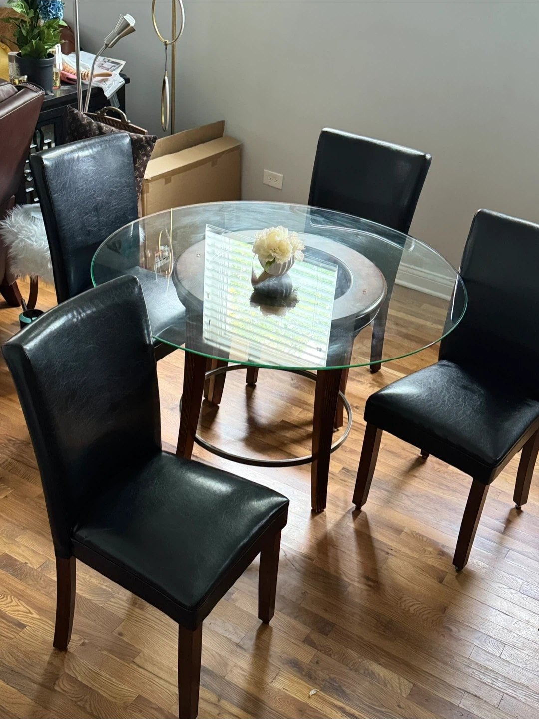 Selling a stylish round dining table with a glass top and four chairs. The chairs have black leather seats and dark wood frames. It's a great set for a smaller dining space or kitchen area! If you are reading this listing item is available. Item will be removed once item is Sold. Message me when you’re ready to arrange pickup. Clean smoke free hm Tags postmodern mcm mod modern minimalist chiclet chair parsons chair milo baughman thayer coggin memphis chair print chairs arm chairs club chairs lounge chairs vintage retro chairs vintage furniture vintage sofa vintage couches loveseat couch moving sale vintage table antique furniture Antique table Antique chairs vintage lamps sofa table cocktail table coffee table curved sofa curved loveseat curved couches paisley chairs paisley print sofa paisley couch comfy sofa chase lounge ottoman barstools round dining table dining chairs dining table solid wood furniture Chase lounge sofa Ottomon Vintage,Solid Wood,Mitchell Gold Bob Williams, MG+BW, Crate & Barrel, West Elm, DWRm Design Within Reach, Pottery Barn, RH, Restoration Hardware, CB2, Modern, Contemporary, Industrial, Z Gallerie, Arhaus, Pier 1, Walter E. Smithe, Overstock, Wayfair, Anthropologie, Loft, Howell Chairs, howell chair, Howell kitchen chairs, Howell dining chair, black vinyl, wood chairs, Metal chairs,Vintage 1975 Barrel Leather Chairs, Walter E. Smithe, Glass Dining Table, Black Leather Dining Chairs, Furniture.