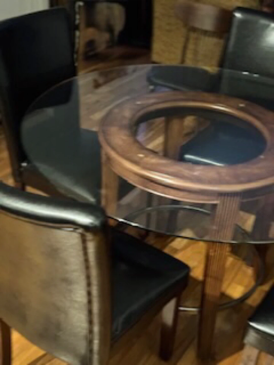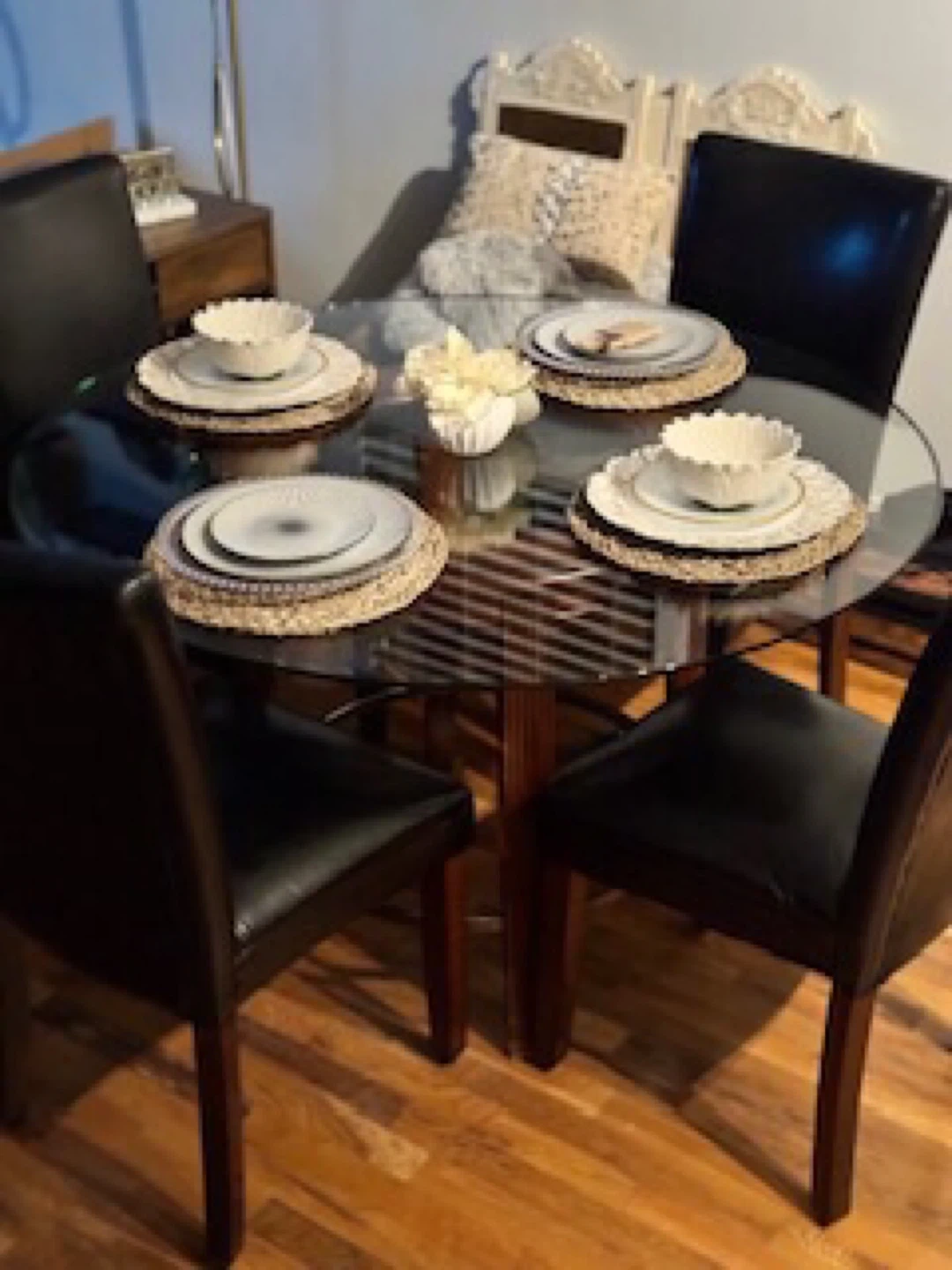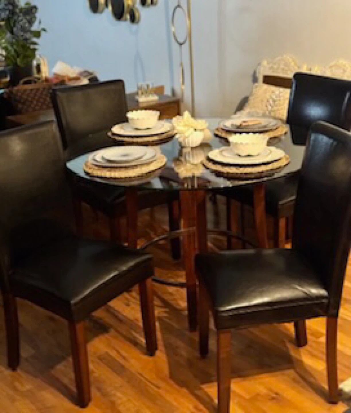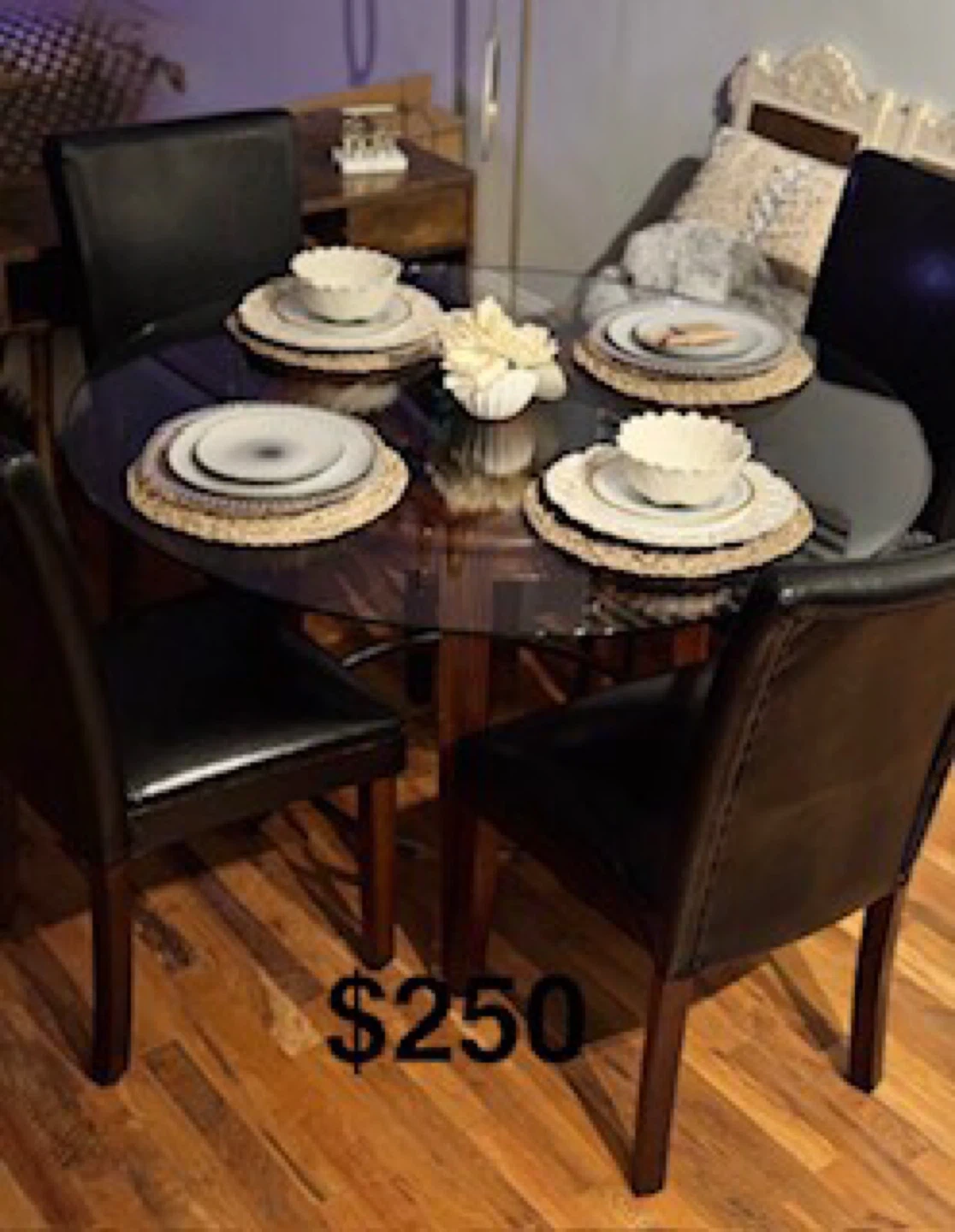 Selling a stylish round dining table with a glass top and four chairs. The chairs have black leather seats and dark wood frames. It's a great set for a smaller dining space or kitchen area! If you are reading this listing item is available. Item will be removed once item is Sold. Message me when you’re ready to arrange pickup. Clean smoke free hm Tags postmodern mcm mod modern minimalist chiclet chair parsons chair milo baughman thayer coggin memphis chair print chairs arm chairs club chairs lounge chairs vintage retro chairs vintage furniture vintage sofa vintage couches loveseat couch moving sale vintage table antique furniture Antique table Antique chairs vintage lamps sofa table cocktail table coffee table curved sofa curved loveseat curved couches paisley chairs paisley print sofa paisley couch comfy sofa chase lounge ottoman barstools round dining table dining chairs dining table solid wood furniture Chase lounge sofa Ottomon Vintage,Solid Wood,Mitchell Gold Bob Williams, MG+BW, Crate & Barrel, West Elm, DWRm Design Within Reach, Pottery Barn, RH, Restoration Hardware, CB2, Modern, Contemporary, Industrial, Z Gallerie, Arhaus, Pier 1, Walter E. Smithe, Overstock, Wayfair, Anthropologie, Loft, Howell Chairs, howell chair, Howell kitchen chairs, Howell dining chair, black vinyl, wood chairs, Metal chairs,Vintage 1975 Barrel Leather Chairs, Walter E. Smithe, Glass Dining Table, Black Leather Dining Chairs, Furniture.