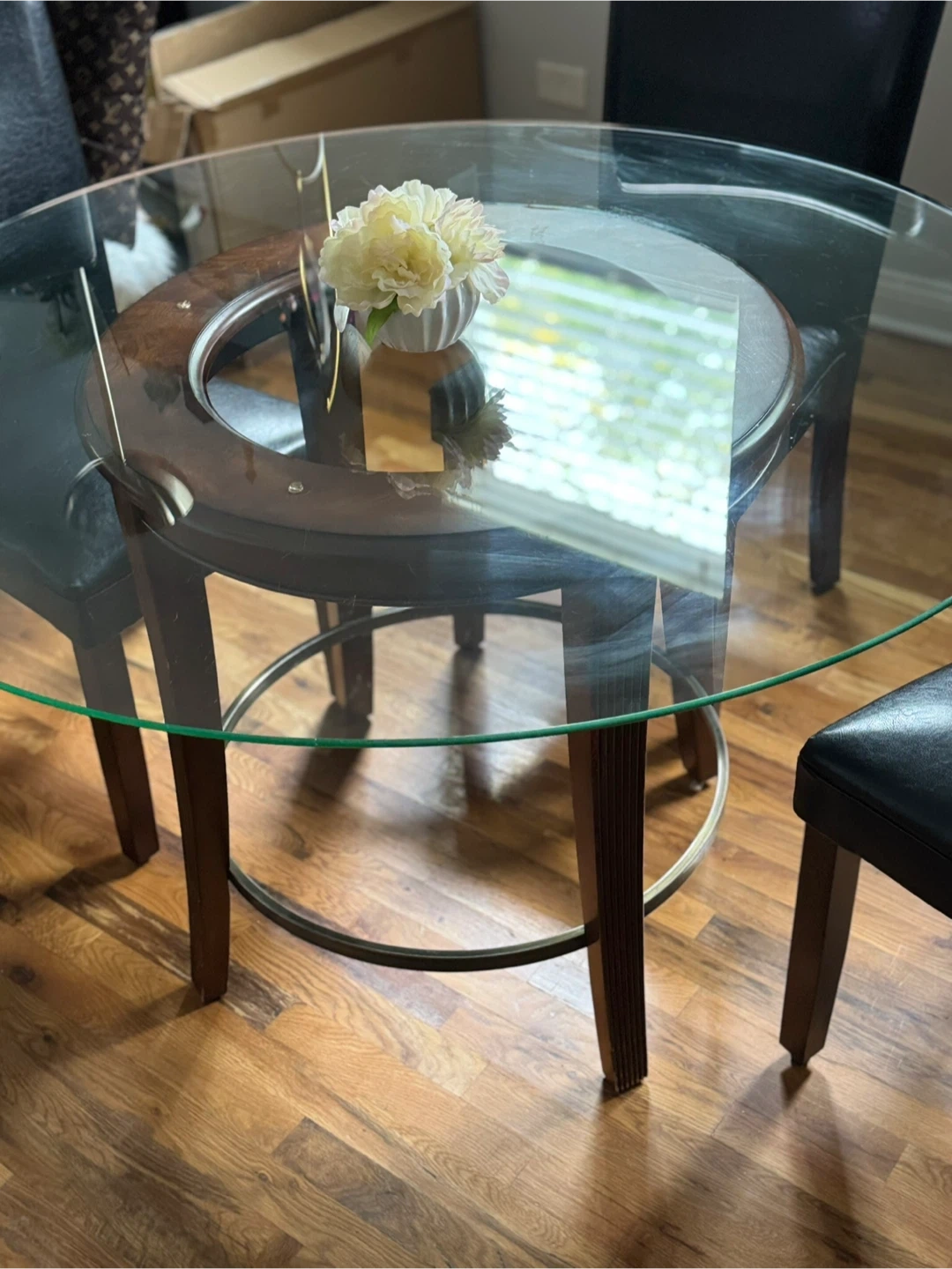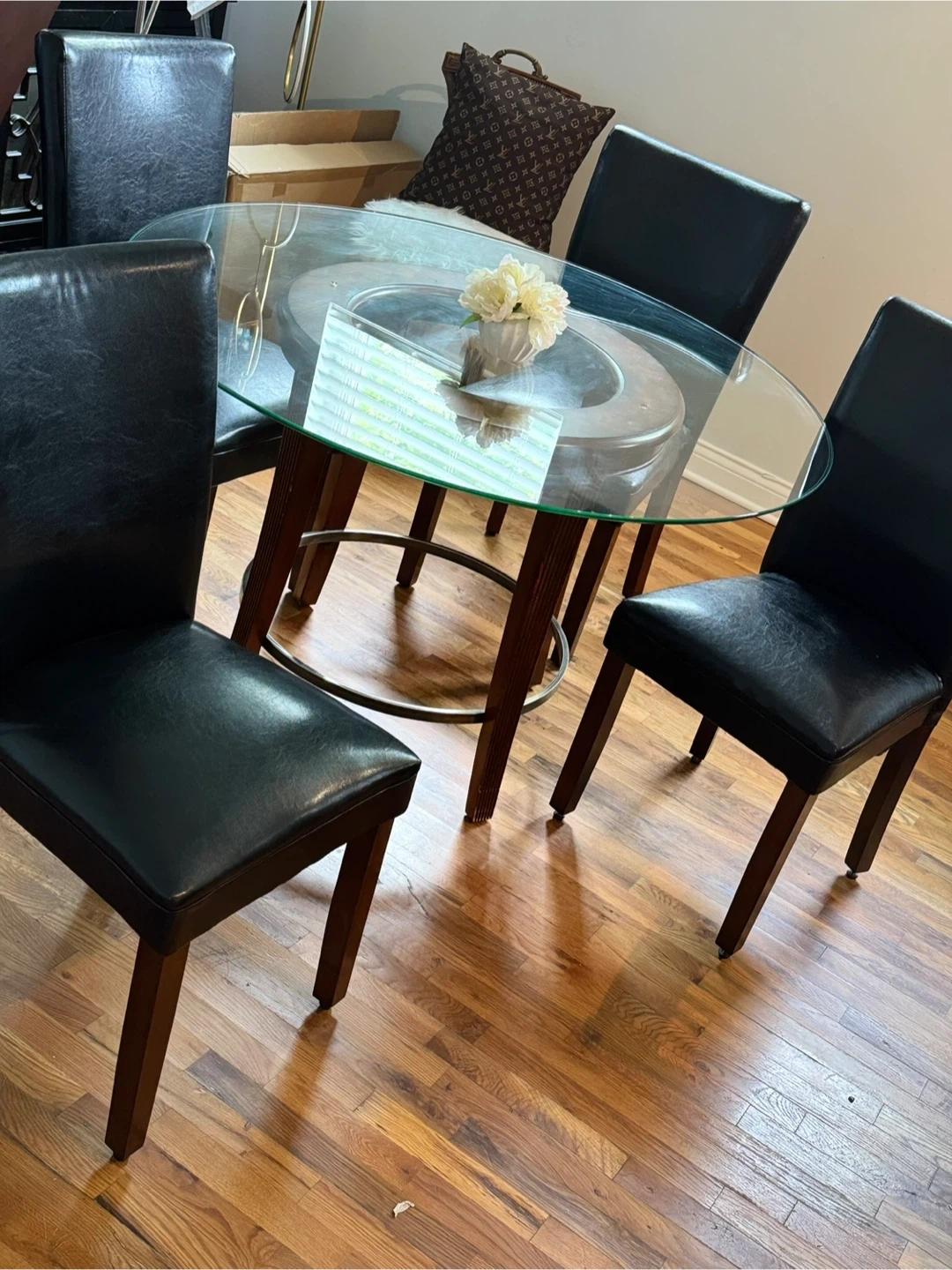 Selling a stylish round dining table with a glass top and four chairs. The chairs have black leather seats and dark wood frames. It's a great set for a smaller dining space or kitchen area! If you are reading this listing item is available. Item will be removed once item is Sold. Message me when you’re ready to arrange pickup. Clean smoke free hm Tags postmodern mcm mod modern minimalist chiclet chair parsons chair milo baughman thayer coggin memphis chair print chairs arm chairs club chairs lounge chairs vintage retro chairs vintage furniture vintage sofa vintage couches loveseat couch moving sale vintage table antique furniture Antique table Antique chairs vintage lamps sofa table cocktail table coffee table curved sofa curved loveseat curved couches paisley chairs paisley print sofa paisley couch comfy sofa chase lounge ottoman barstools round dining table dining chairs dining table solid wood furniture Chase lounge sofa Ottomon Vintage,Solid Wood,Mitchell Gold Bob Williams, MG+BW, Crate & Barrel, West Elm, DWRm Design Within Reach, Pottery Barn, RH, Restoration Hardware, CB2, Modern, Contemporary, Industrial, Z Gallerie, Arhaus, Pier 1, Walter E. Smithe, Overstock, Wayfair, Anthropologie, Loft, Howell Chairs, howell chair, Howell kitchen chairs, Howell dining chair, black vinyl, wood chairs, Metal chairs,Vintage 1975 Barrel Leather Chairs, Walter E. Smithe, Glass Dining Table, Black Leather Dining Chairs, Furniture.