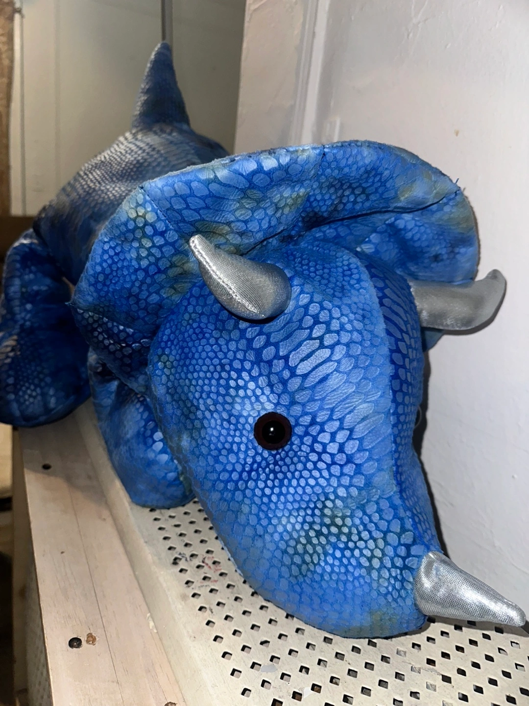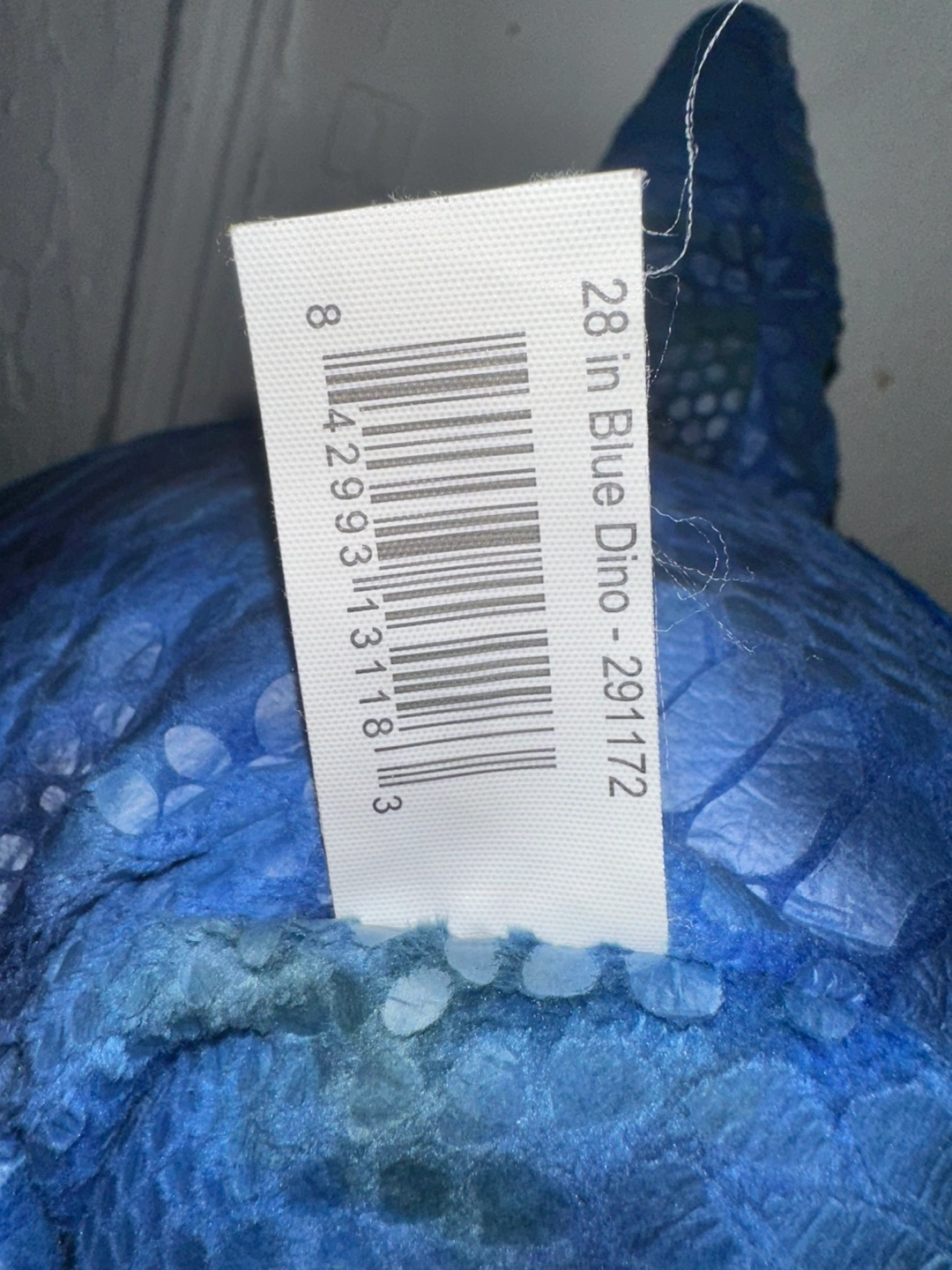 1000+Large blue plush dinosaur. Measures 28 inches. Unique tie-dye design. Silver horns.
