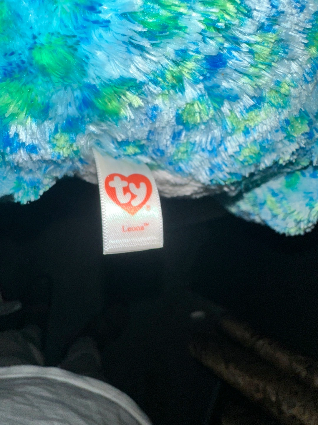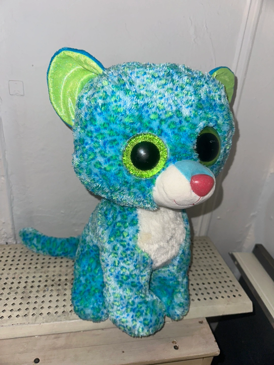 1000+Large blue and green leopard plush toy. Big, sparkly eyes. Soft fur. Collectible Beanie Boo.