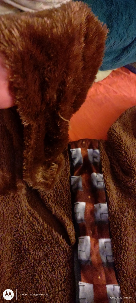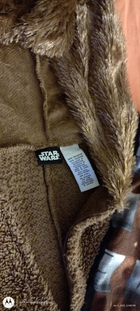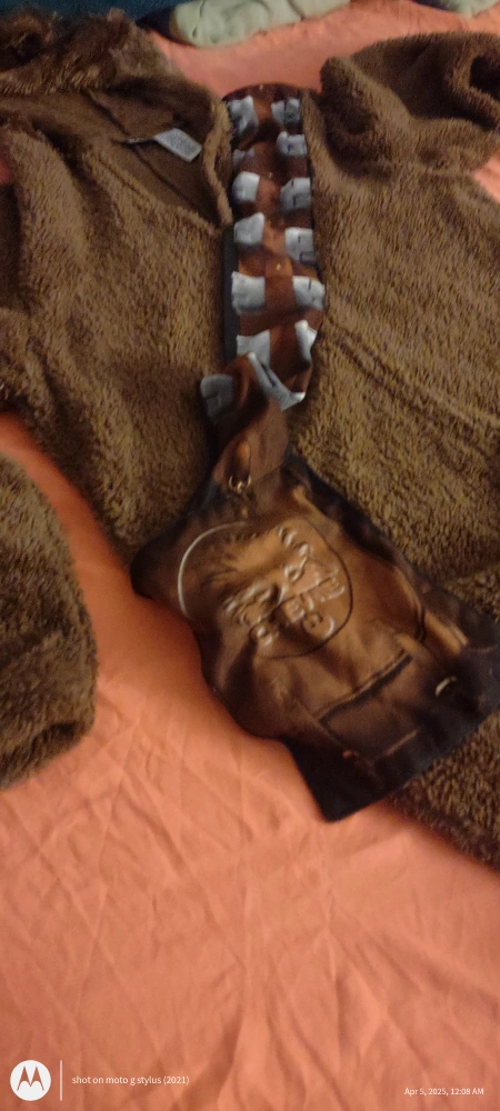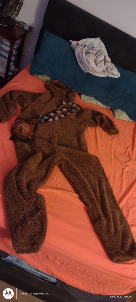 381Adult Chewbacca onesie pajamas. Brown fuzzy material. Features Chewbacca's bandolier and pouch. Has pockets. 100% polyester.