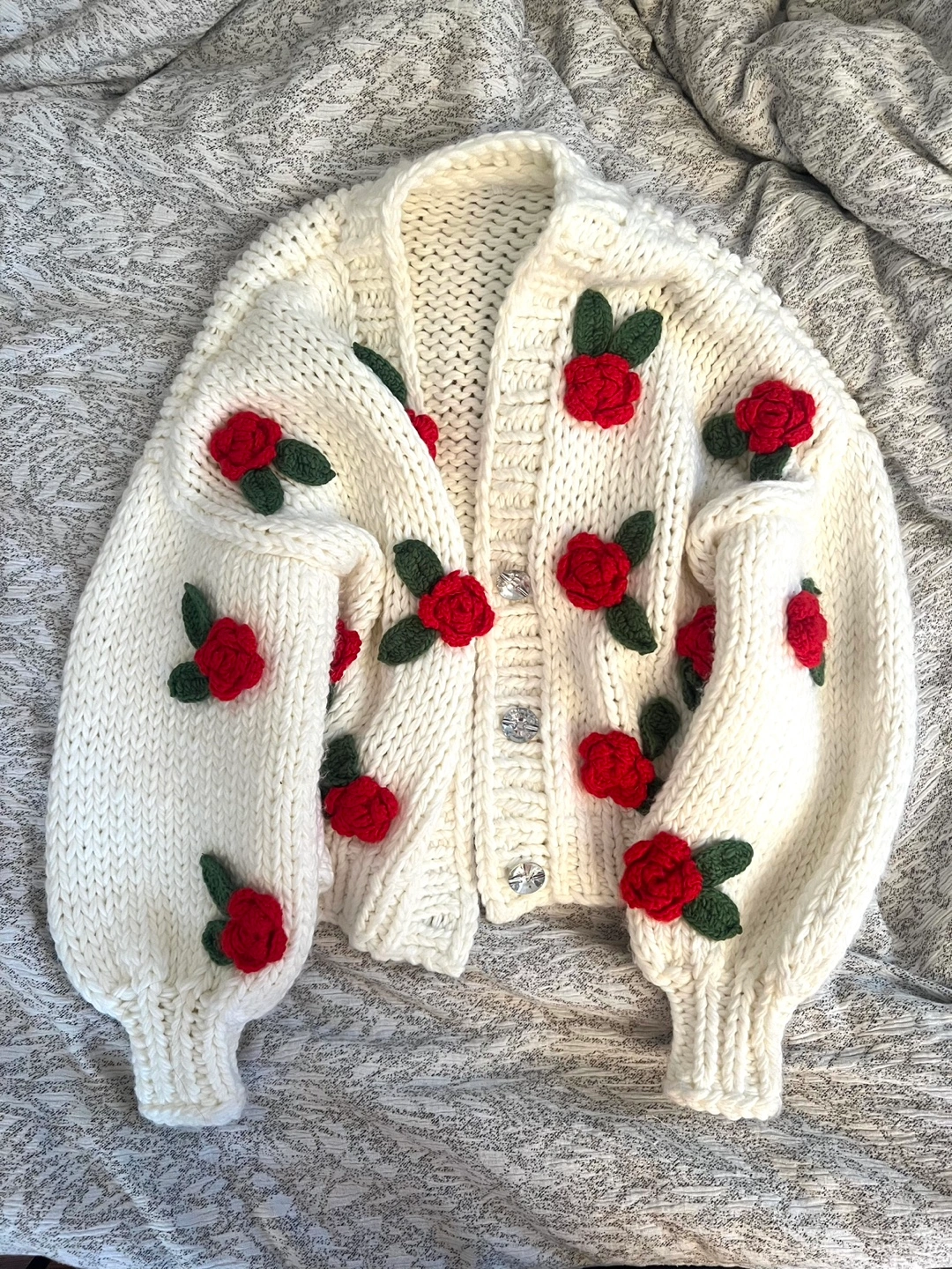 NWOT Chunky Oversized Hand Knitted Cardigan with Roses