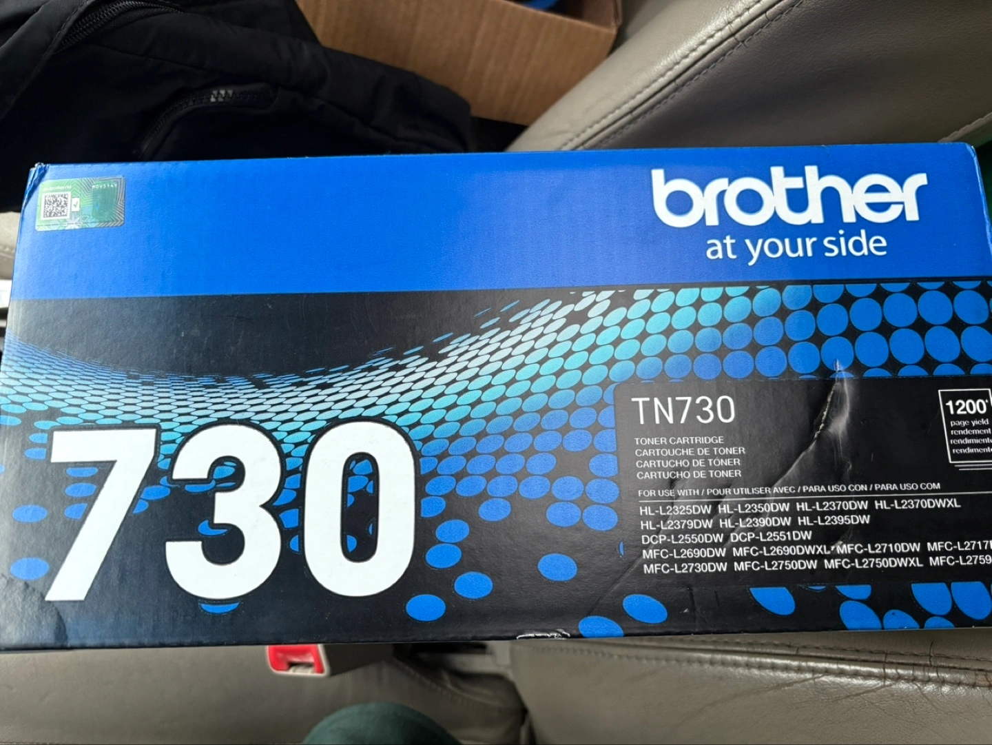109Brother TN730 toner cartridge. 1200 page yield. Compatible with several Brother printer models.