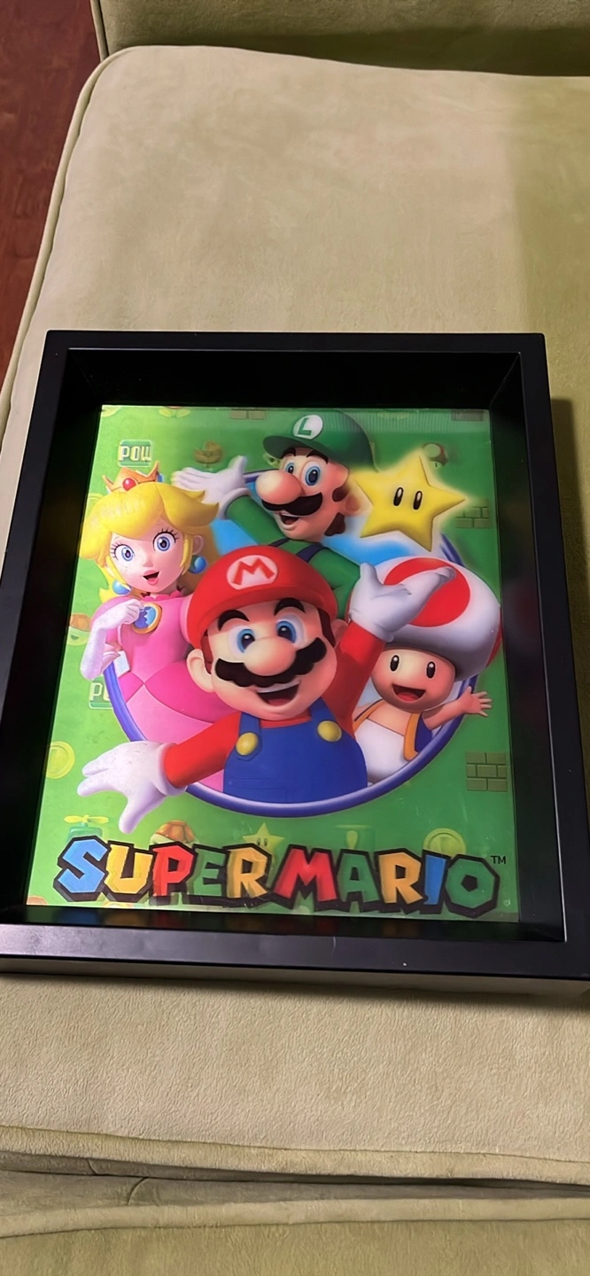 15Super Mario Brothers framed print. Features Mario, Luigi, Peach, and Toad. Black frame. Great for a gamer's room.