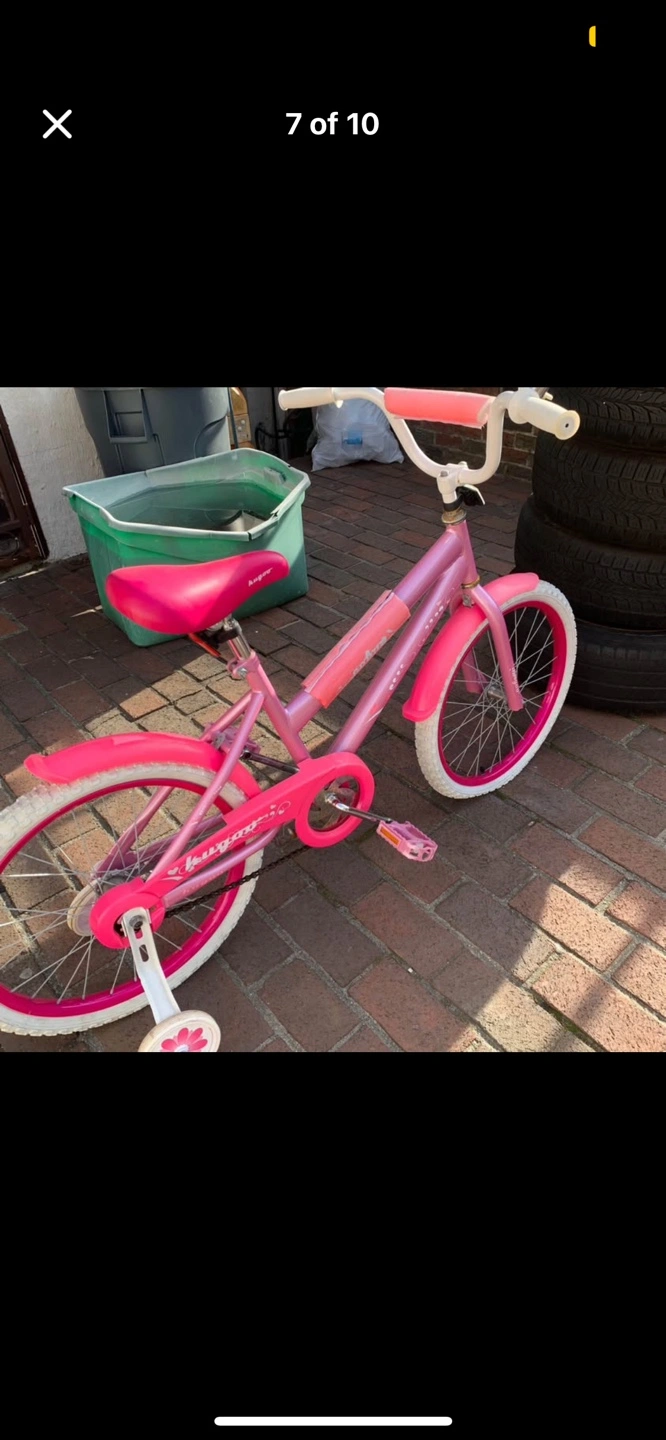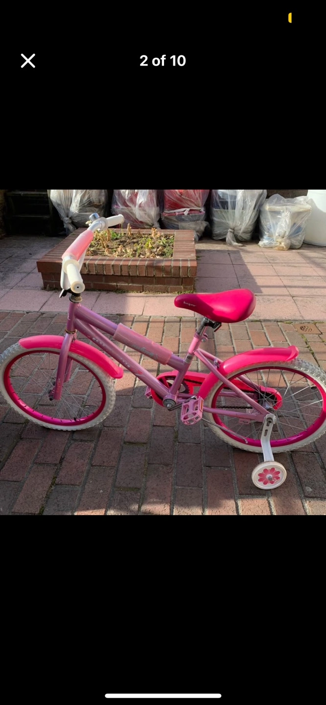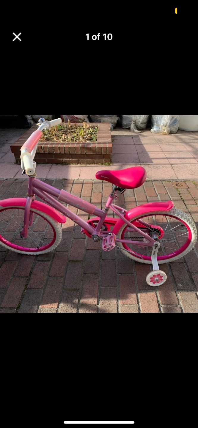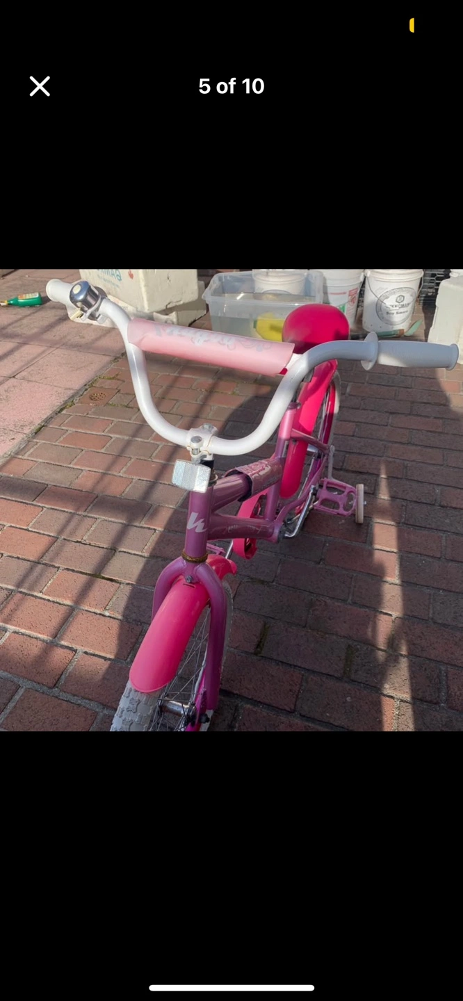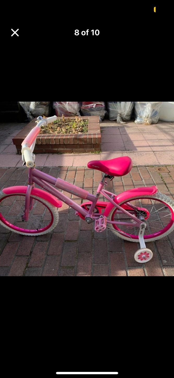 The bike still in usable condition maybe need small fixes and tires air. Used girls' bike. Pink and purple. 16 inch wheels. Includes training wheels. Good condition.